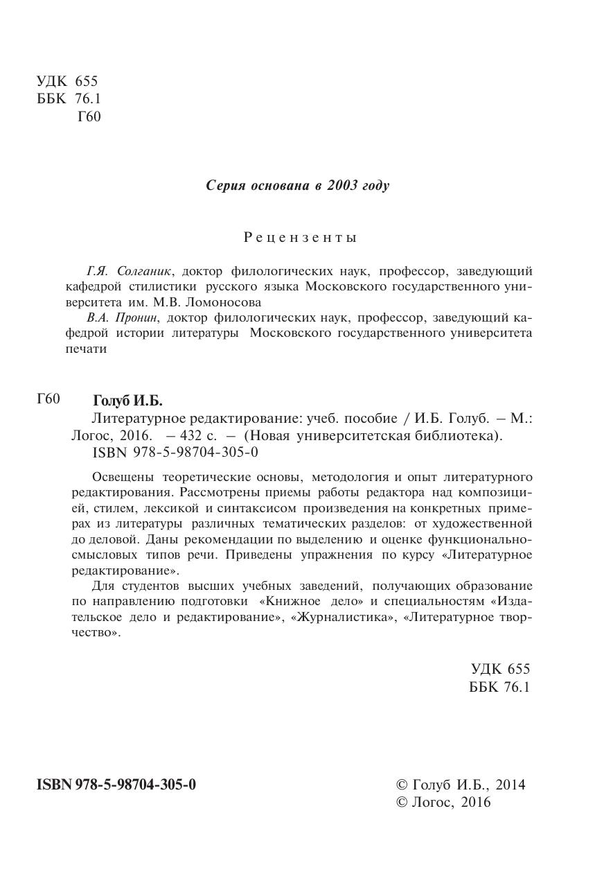Освещены теоретические основы, методология и опыт литературного редактирования. Рассмотрены приемы работы редактора над композицией, стилем, лексикой и синтаксисом произведения на конкретных примерах из литературы различных тематических разделов: от художественной до деловой. Даны рекомендации по выделению и оценке функционально-смысловых типов речи. Приведены упражнения по курсу «Литературное редактирование». Для студентов высших учебных заведений, получающих образование по направлению подготовки «Книжное дело» и специальностям «Издательское дело и редактирование», «Журналистика», «Литературное творчество».