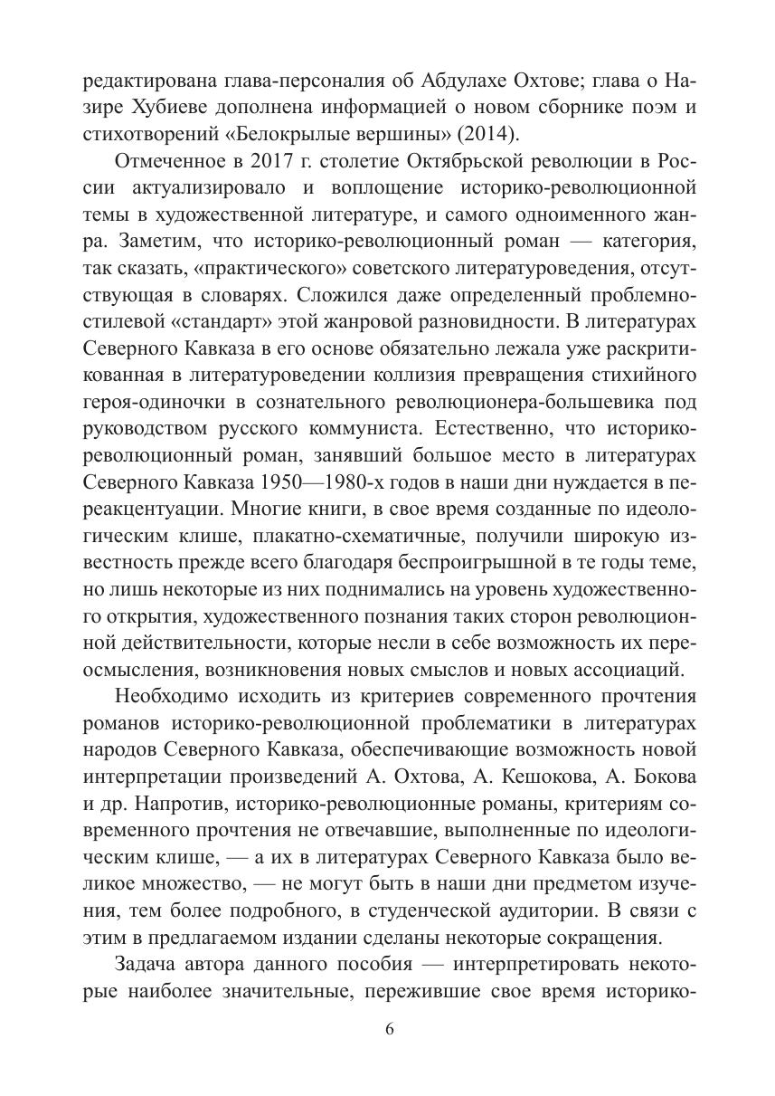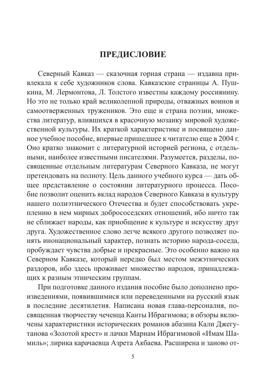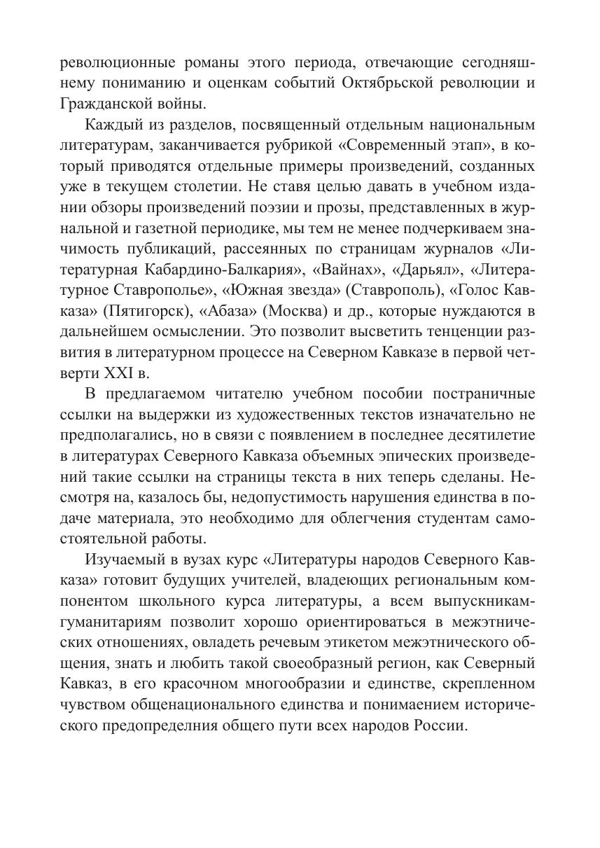 В учебном пособии Заслуженного профессора Северо-Кавказского федерального университета дана общая характеристика литератур народов Северного Кавказа. Главы, посвященные отдельным литературам, содержат обстоятельные обзоры литературного процесса в республиках; в главах-персоналиях подробно рассматривается творчество Коста Хетагурова, Эффенди Капиева, Расула Гамзатова, Кайсына Кулиева, Алима Кешокова, Ахмедхана Абу-Бакара, Назира Хубиева, Исы Капаева, Мусы Ахмадова, Алана Черчесова, Канты Ибрагимова и многих других выдающихся писателей Северного Кавказа. Представленные в пособии произведения северокавказских авторов будут способствовать гармонизации межнациональных отношений и формированию общероссийской идентичности.