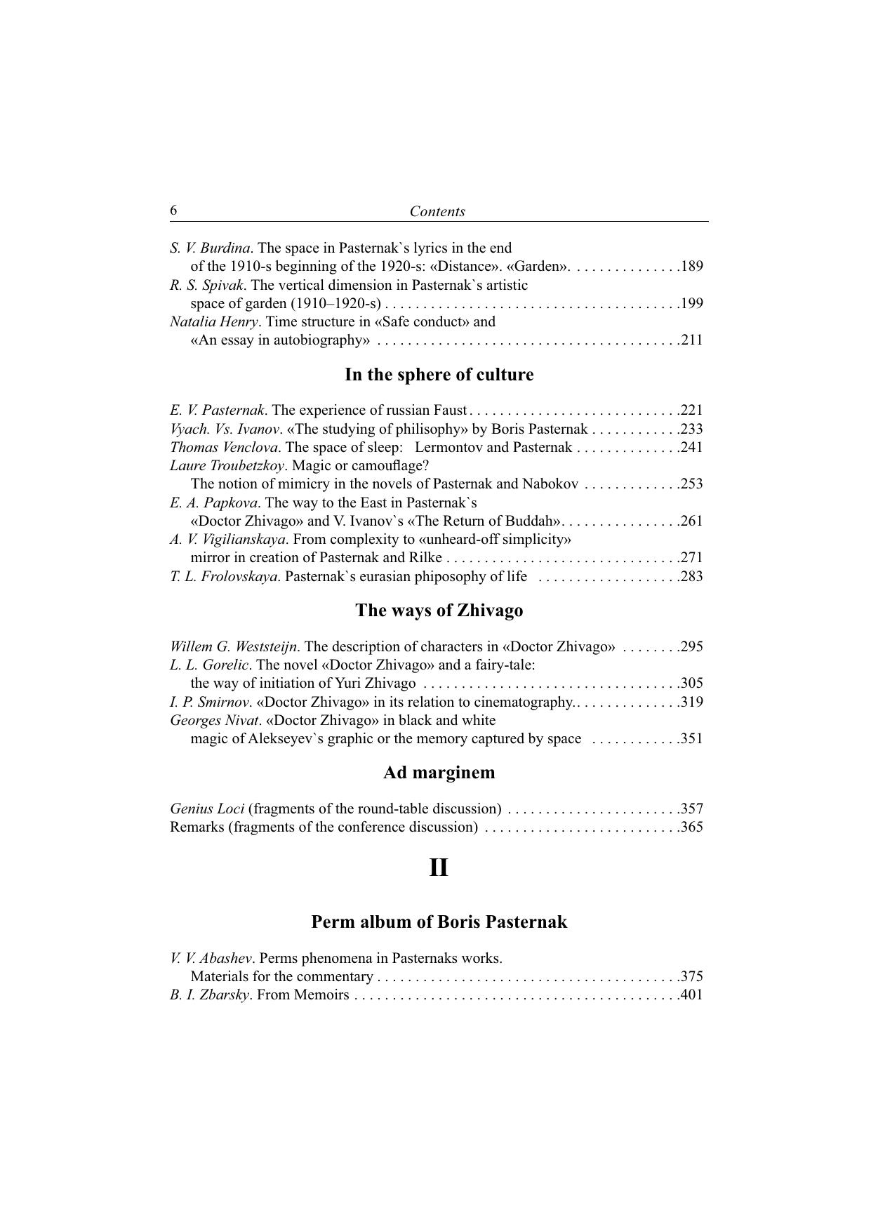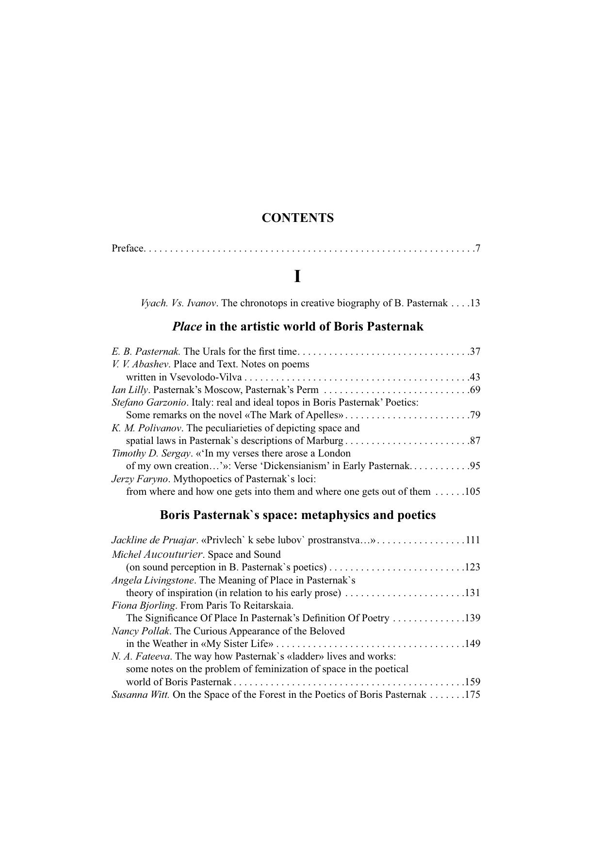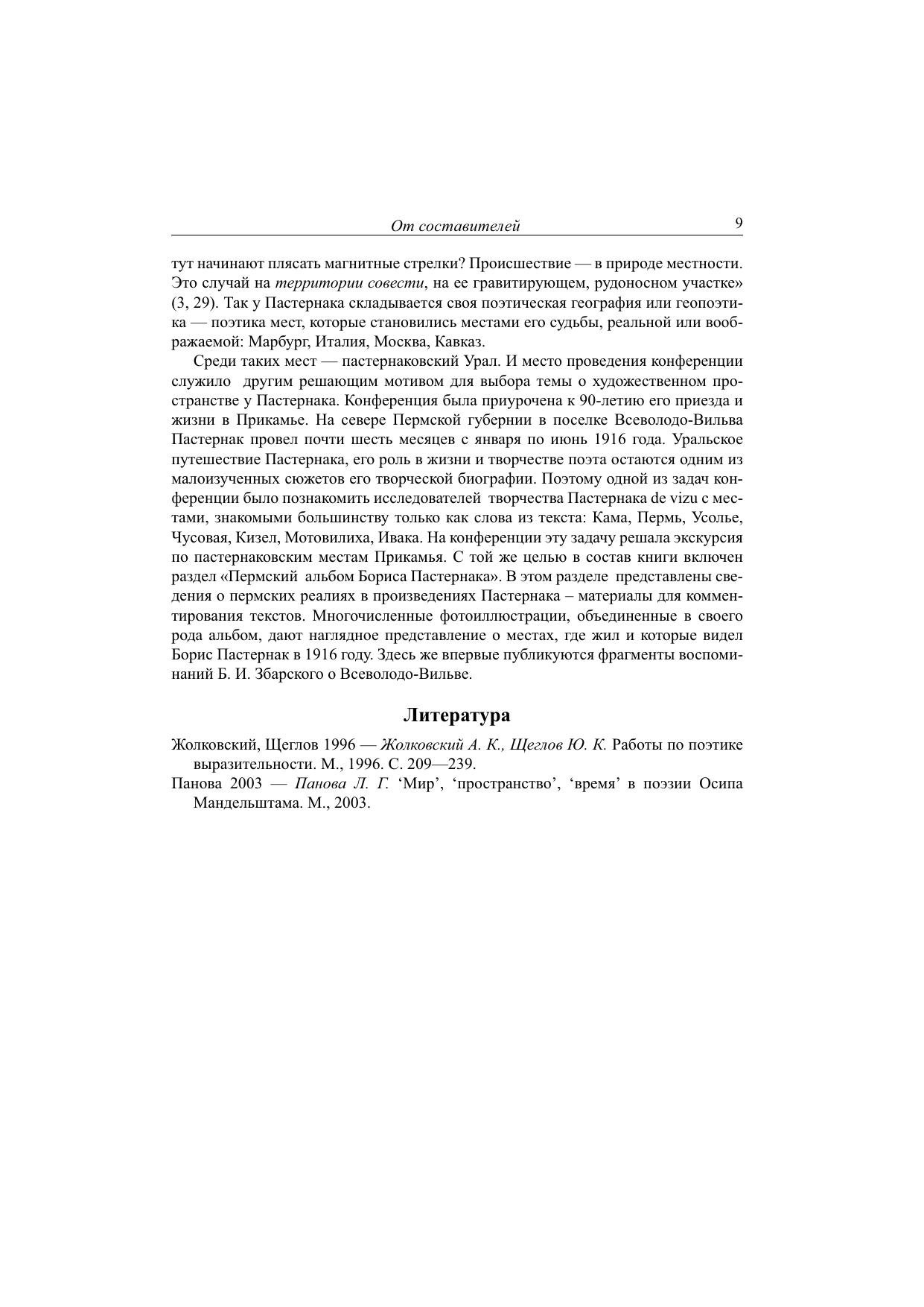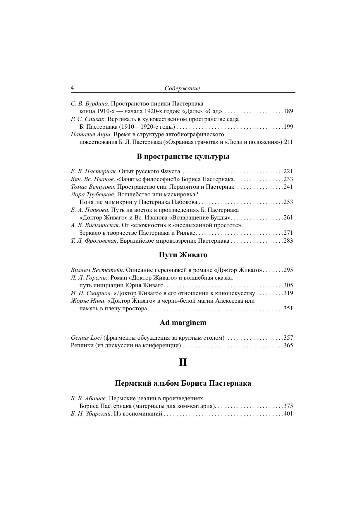 Основную часть книги составляют материалы Международной конференции «"Любовь пространства…": Поэтика места в художественном мире и судьбе Бориса Пастернака» (Пермь, 2006). В первой части сборника размещены статьи, посвященные исследованию как географически локализованных мест жизни и творчества Пастернака (Италия, Марбург, Урал, Москва), так и универсальных локусов пастернаковского художественного пространства (лестница, сад, лес и др.). Значительное внимание уделяется поэтике романа «Доктор Живаго». Содержание второго раздела сборника «Пермский альбом Бориса Пастернака» мотивировано местом и временем проведения конференции: Пермский край, год 90-летия путешествия Бориса Пастернака на Урал. В этом разделе представлены сведения о пермских реалиях пастернаковских произведений и альбом фотоиллюстраций. Здесь также впервые публикуются фрагменты воспоминаний Б. И. Збарского о жизни во Всеволодо-Вильве.