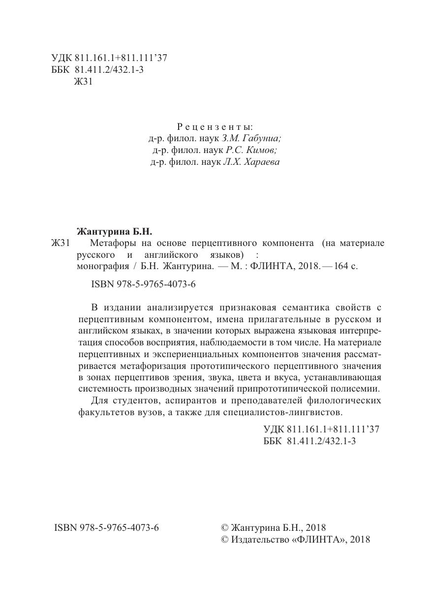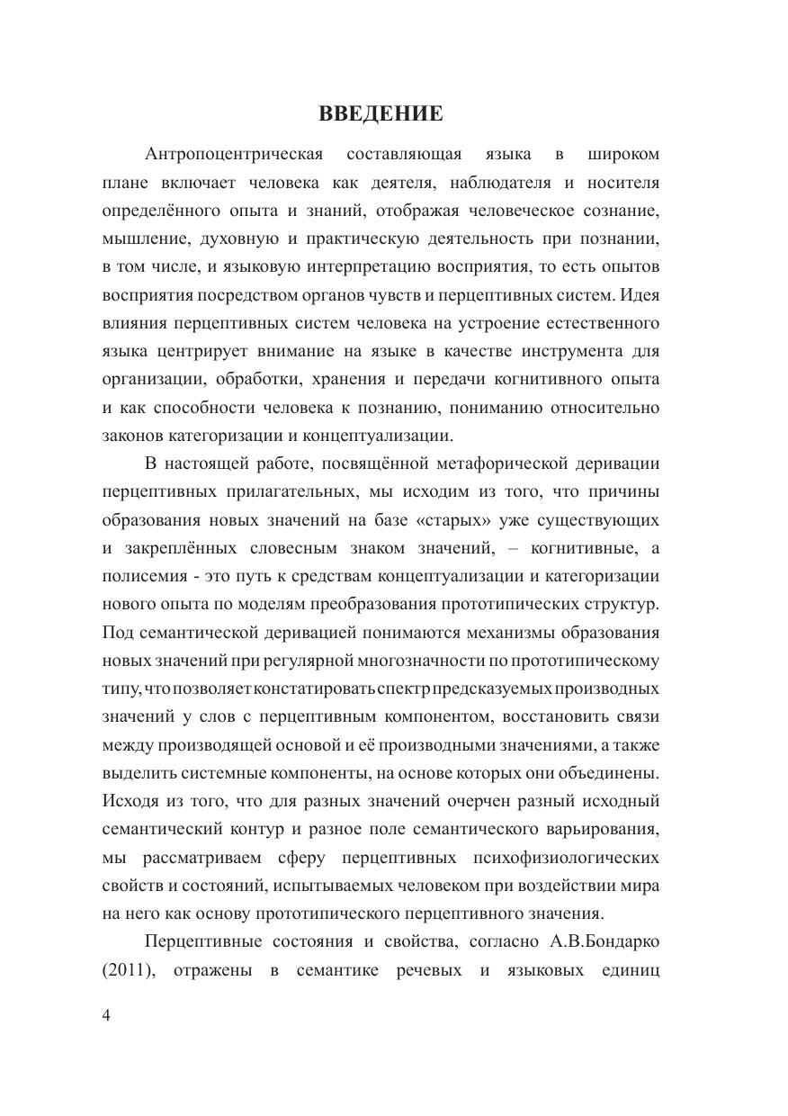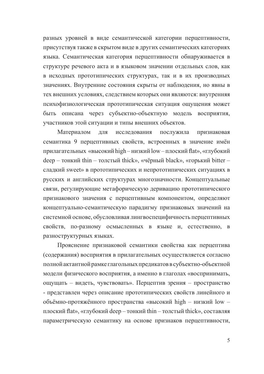 В издании анализируется признаковая семантика свойств с перцептивным компонентом, имена прилагательные в русском и английском языках, в значении которых выражена языковая интерпретация способов восприятия, наблюдаемости в том числе. На материале перцептивных и экспериенциальных компонентов значения рассматривается метафоризация прототипического перцептивного значения в зонах перцептивов зрения, звука, цвета и вкуса, устанавливающая системность производных значений припрототипической полисемии.