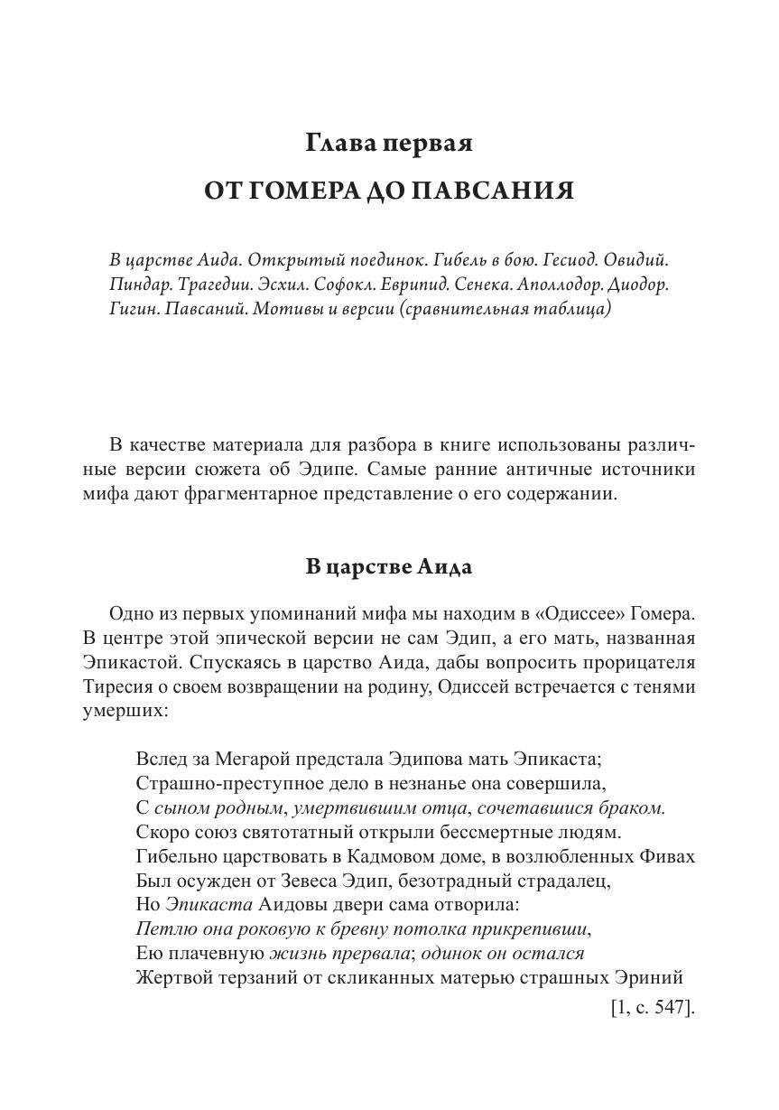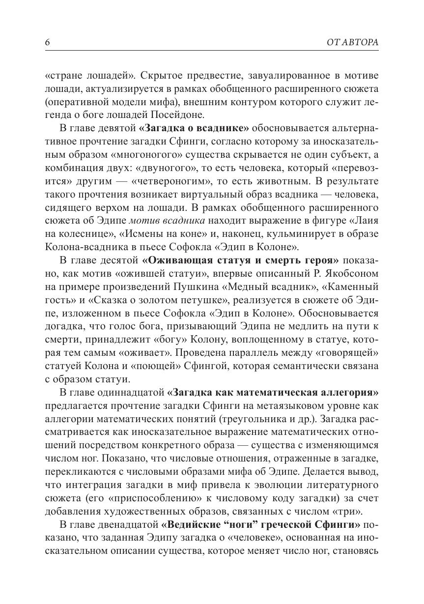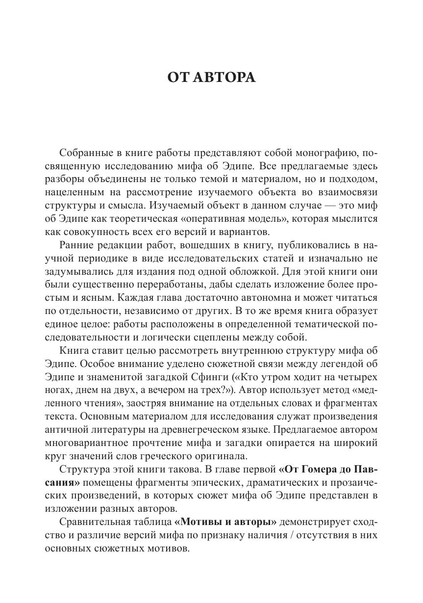 Монография посвящена проблемам интерпретации самого известного мифа в мировой культуре — мифа об Эдипе. Предлагаемые вниманию читателя работы объединены не только темой и материалом, но и общим подходом, нацеленным на рассмотрение изучаемого объекта во взаимосвязи структуры и смысла. Изучаемый объект в данном случае — это миф об Эдипе, который понимается как совокупность всех его версий и вариантов. Особое внимание уделено связи между легендой об Эдипе и знаменитой загадкой Сфинги («Кто утром ходит на четырех ногах, днем на двух, а вечером на трех?»). Основным материалом для исследования служат произведения античной литературы на древнегреческом языке. Опираясь на широкий круг значений слов греческого оригинала, автор предлагает многовариантное прочтение загадки и мифа.