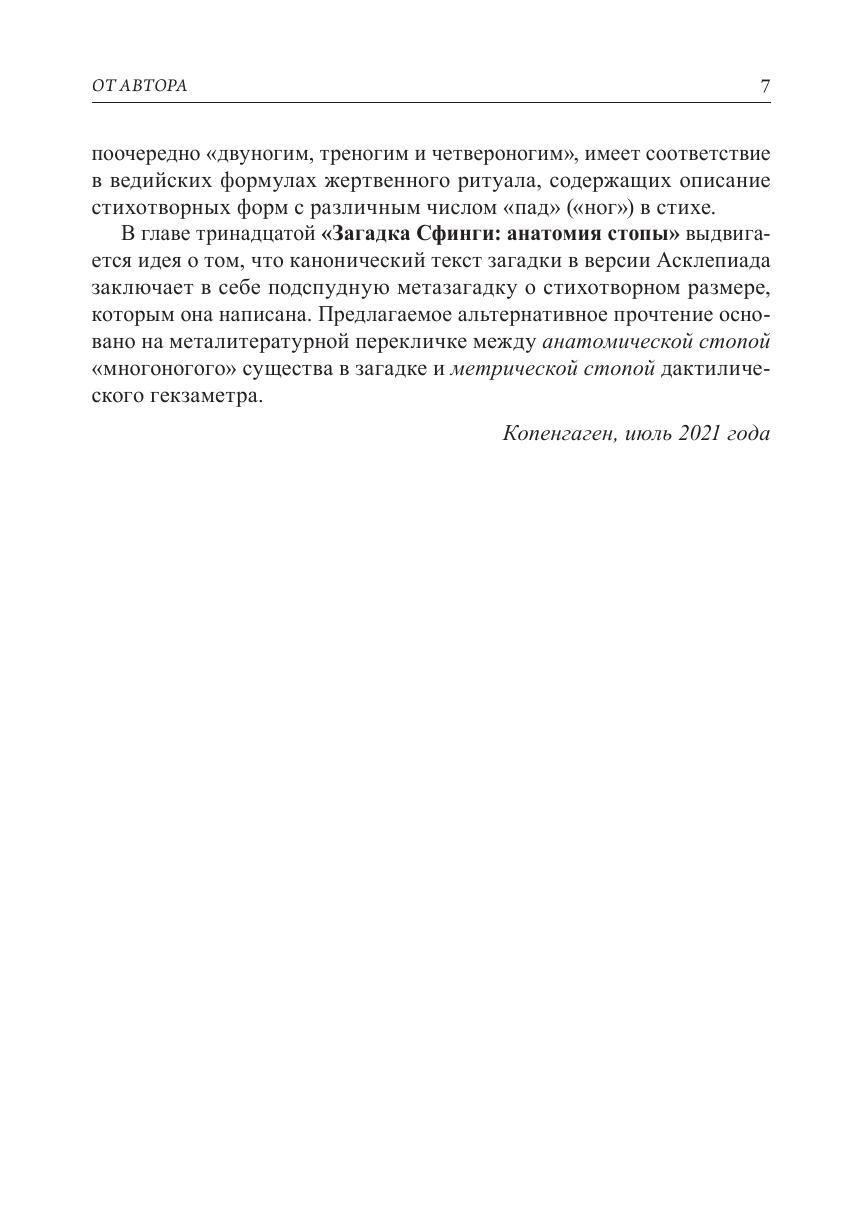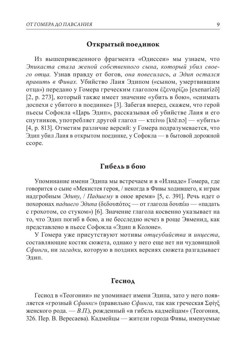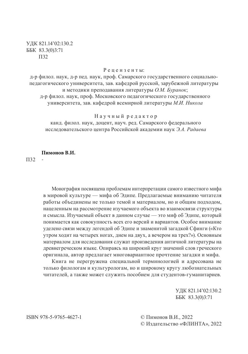 Монография посвящена проблемам интерпретации самого известного мифа в мировой культуре — мифа об Эдипе. Предлагаемые вниманию читателя работы объединены не только темой и материалом, но и общим подходом, нацеленным на рассмотрение изучаемого объекта во взаимосвязи структуры и смысла. Изучаемый объект в данном случае — это миф об Эдипе, который понимается как совокупность всех его версий и вариантов. Особое внимание уделено связи между легендой об Эдипе и знаменитой загадкой Сфинги («Кто утром ходит на четырех ногах, днем на двух, а вечером на трех?»). Основным материалом для исследования служат произведения античной литературы на древнегреческом языке. Опираясь на широкий круг значений слов греческого оригинала, автор предлагает многовариантное прочтение загадки и мифа.