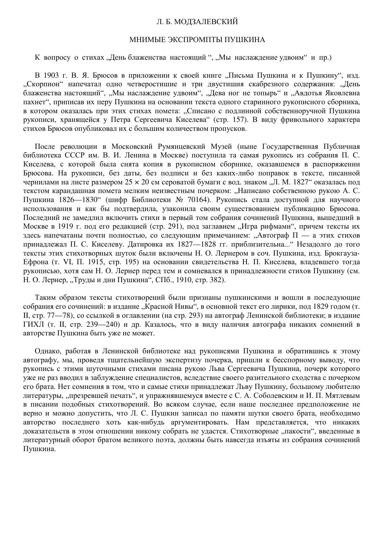 Мнимые экспромпты Пушкина. (К вопросу о стихах "День блаженства настоящий", "Мы наслаждение удвоим" и пр.)