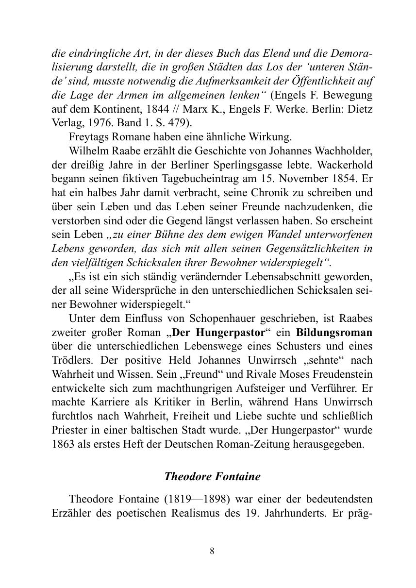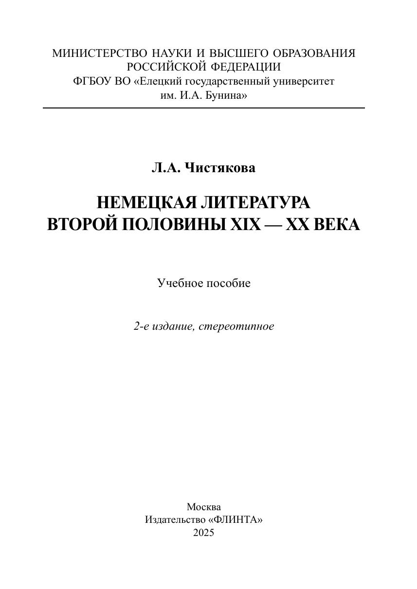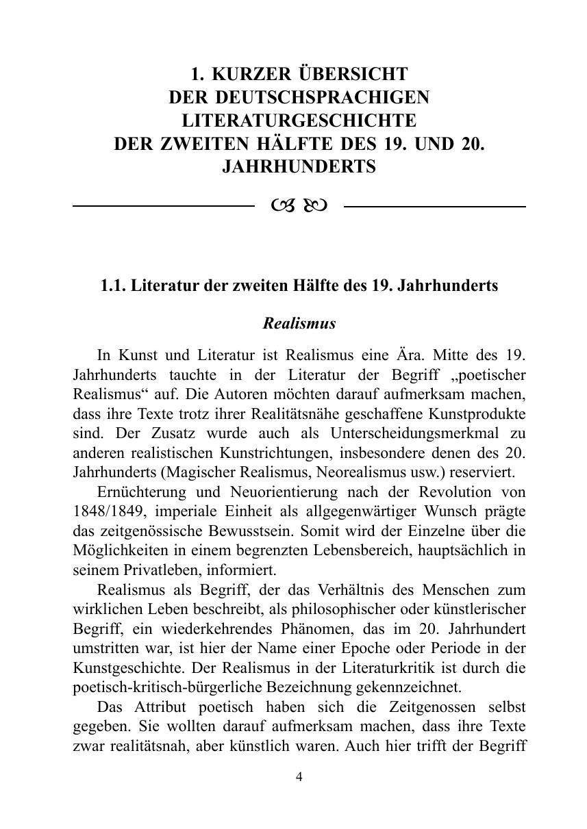 Учебное пособие содержит обзор литературного процесса Германии второй половины XIX — XX века на немецком языке, а также методические материалы по анализу художественного текста, необходимые для развития навыков самостоятельной интерпретации и глубокого проникновения в идейно-тематическое содержание литературного произведения.
