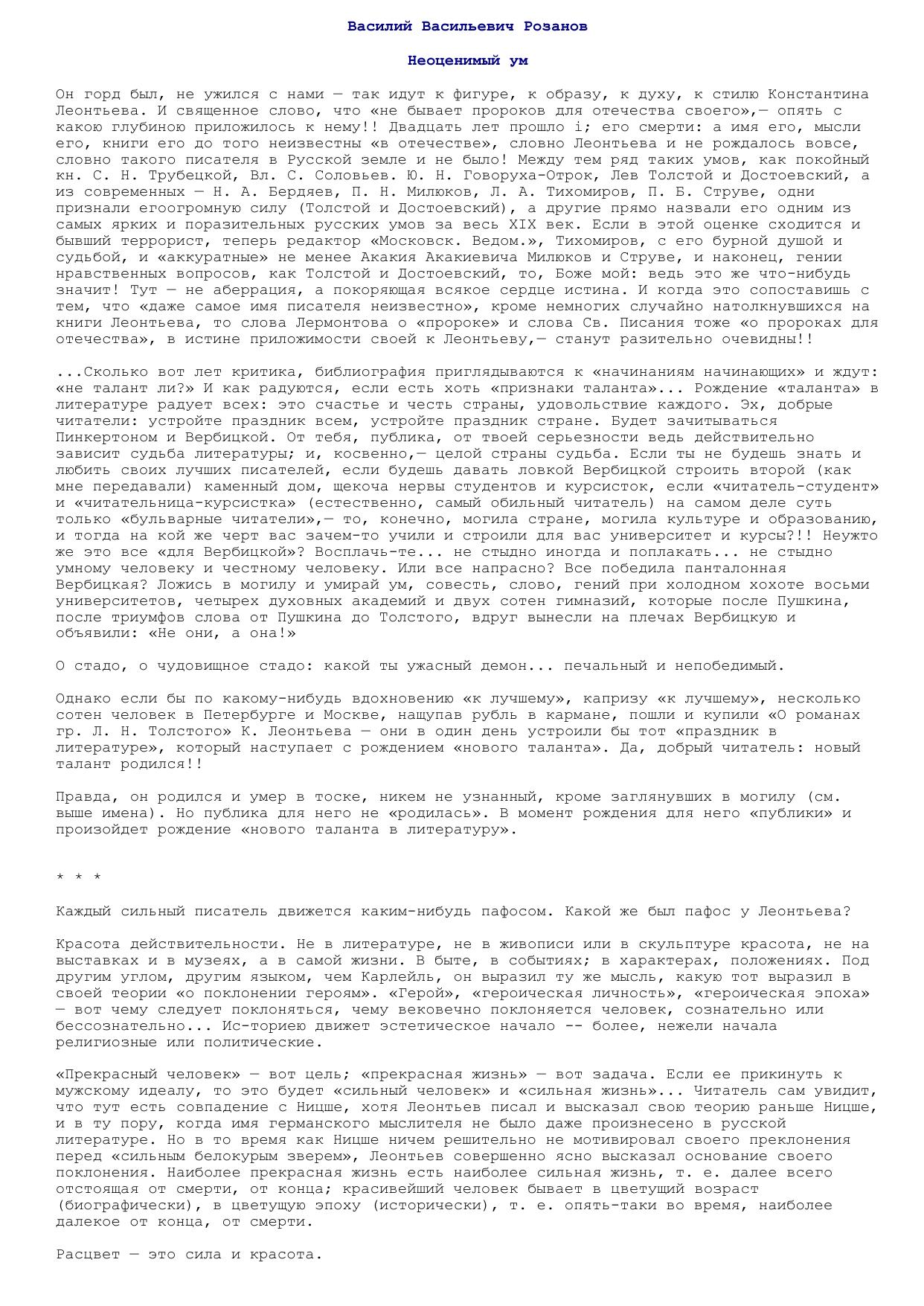Неоценимый ум. [о критике Толстого Леонтьевым]