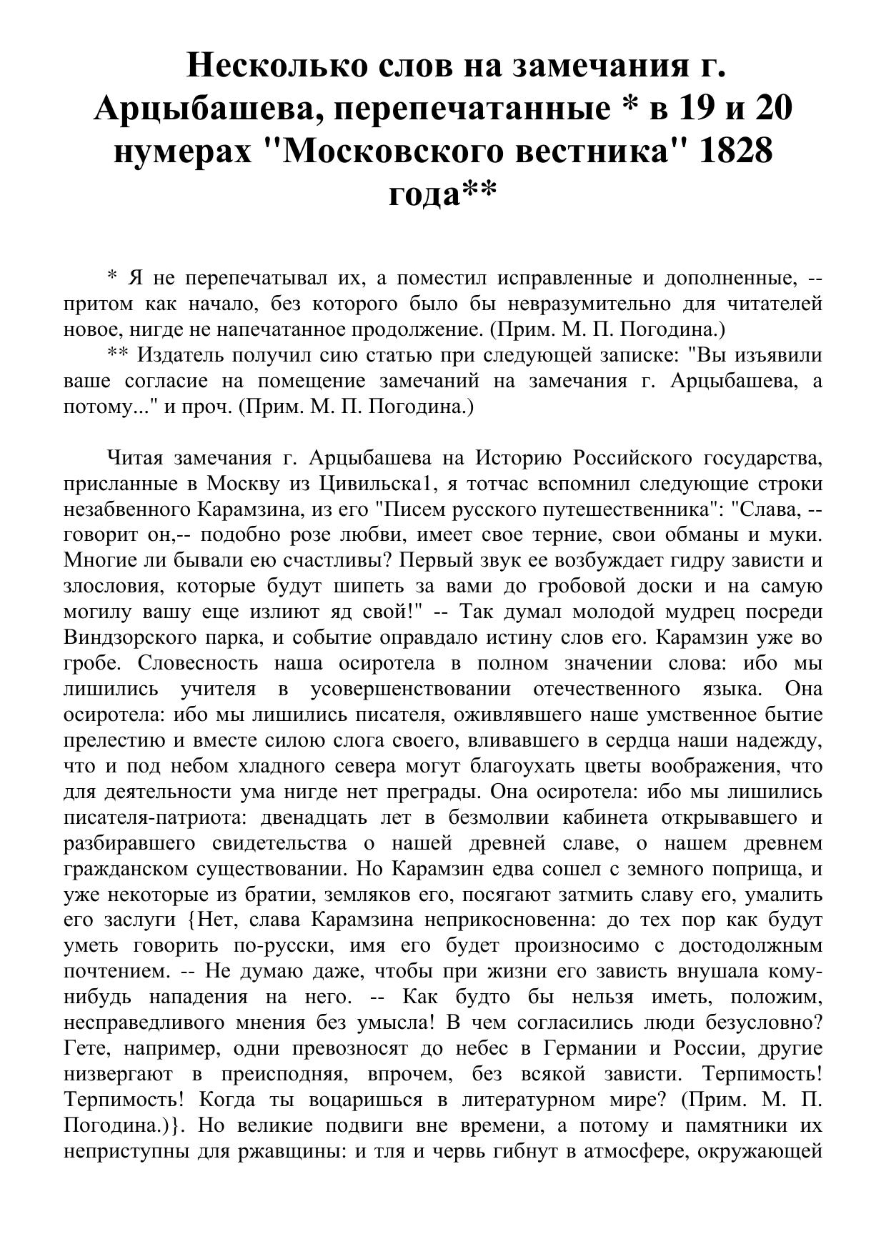 Несколько слов на замечания г. Арцыбашева, перепечатанные в 19 и 20 нумерах "Московского вестника" 1828 года