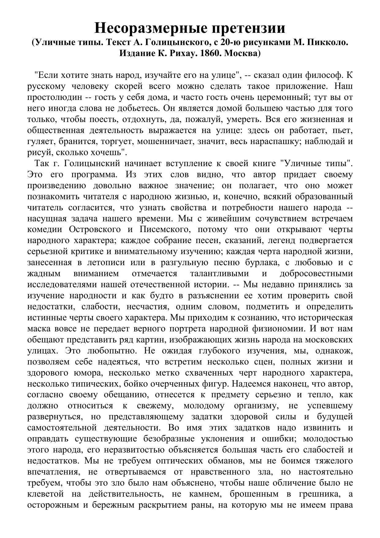Несоразмерные претензии (Уличные типы. Текст А. Голицынского, с 20-ю рисунками М. Пикколо. Издание К. Рихау. 1860. Москва)