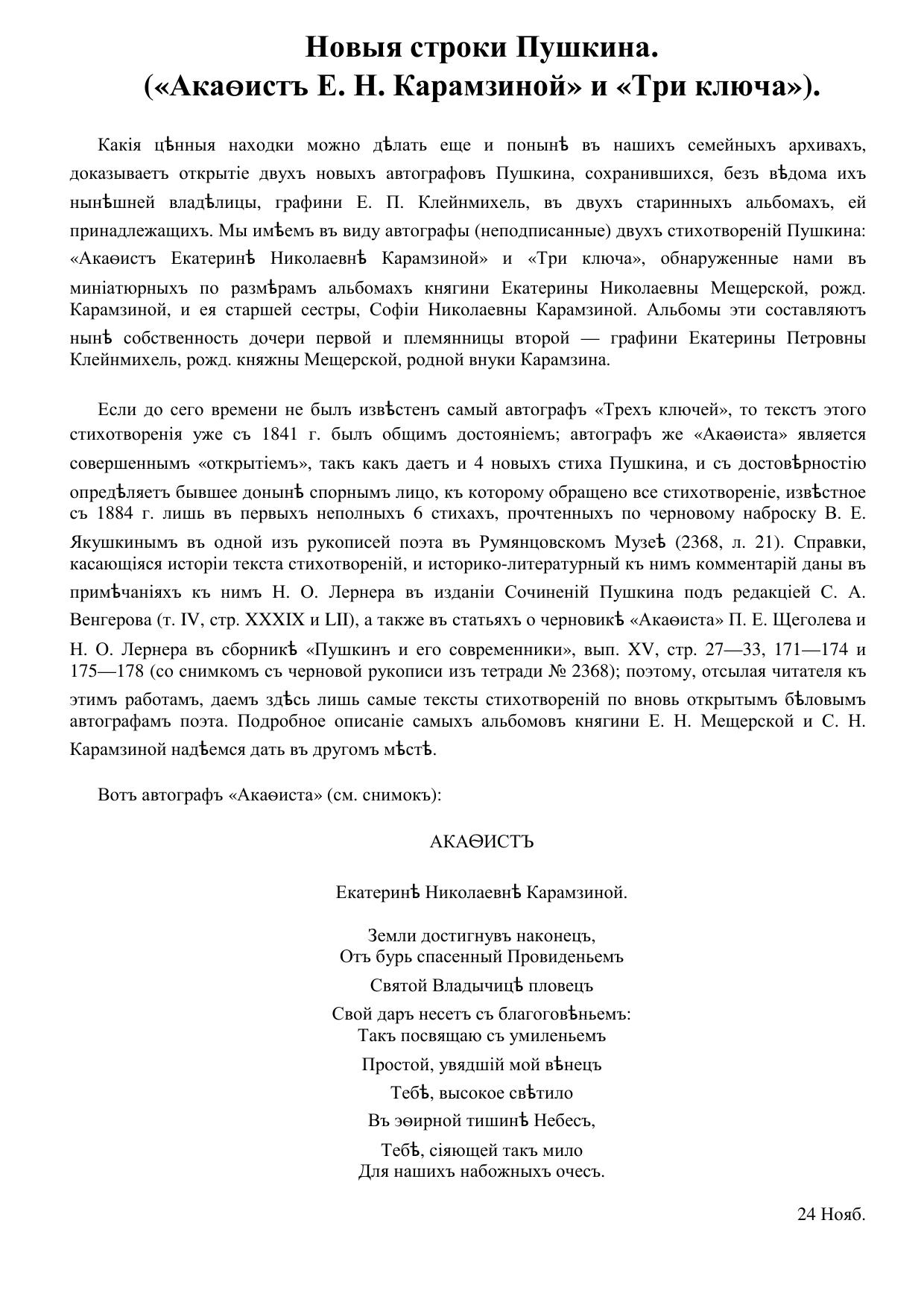 Новые строки Пушкина. ("Акафист Е.Н. Карамзиной" и "Три ключа")