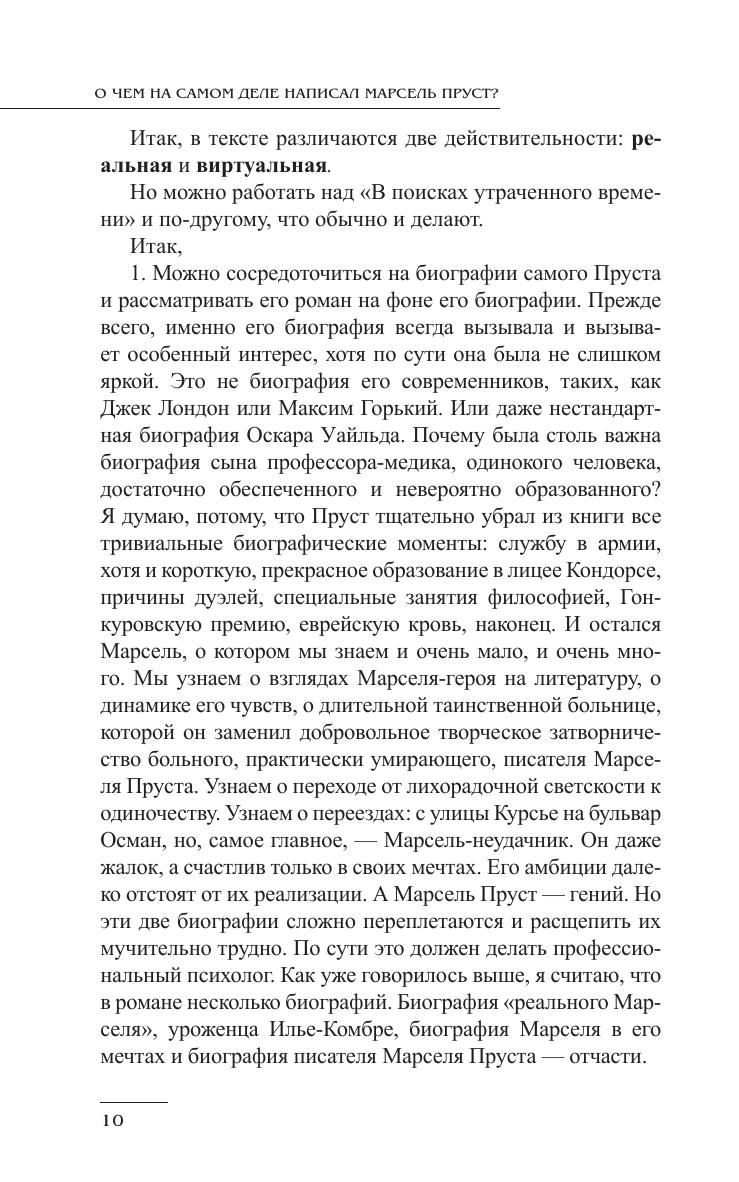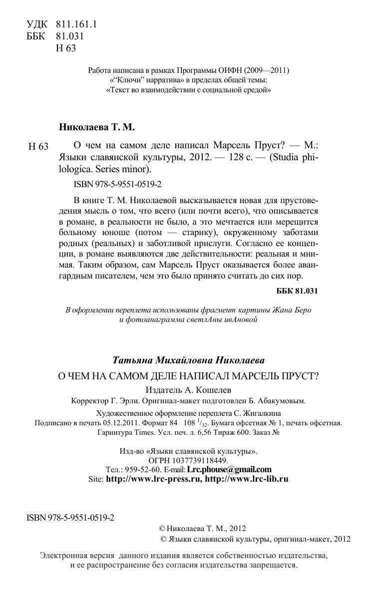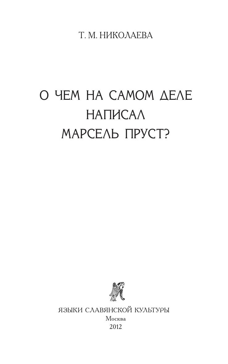 В книге Т.M.Николаевой высказывается новая для прустоведения мысль о том, что всего (или почти всего), что описывается в романе, в реальности не было, а это мечтается или мерещится больному юноше (потом - старику), окруженному заботами родных (реальных) и заботливой прислуги. Согласно ее концепции, в романе выявляются две действительности: реальная и мнимая. Таким образом, сам Марсель Пруст оказывается более авангардным писателем, чем это было принято считать до сих пор.
