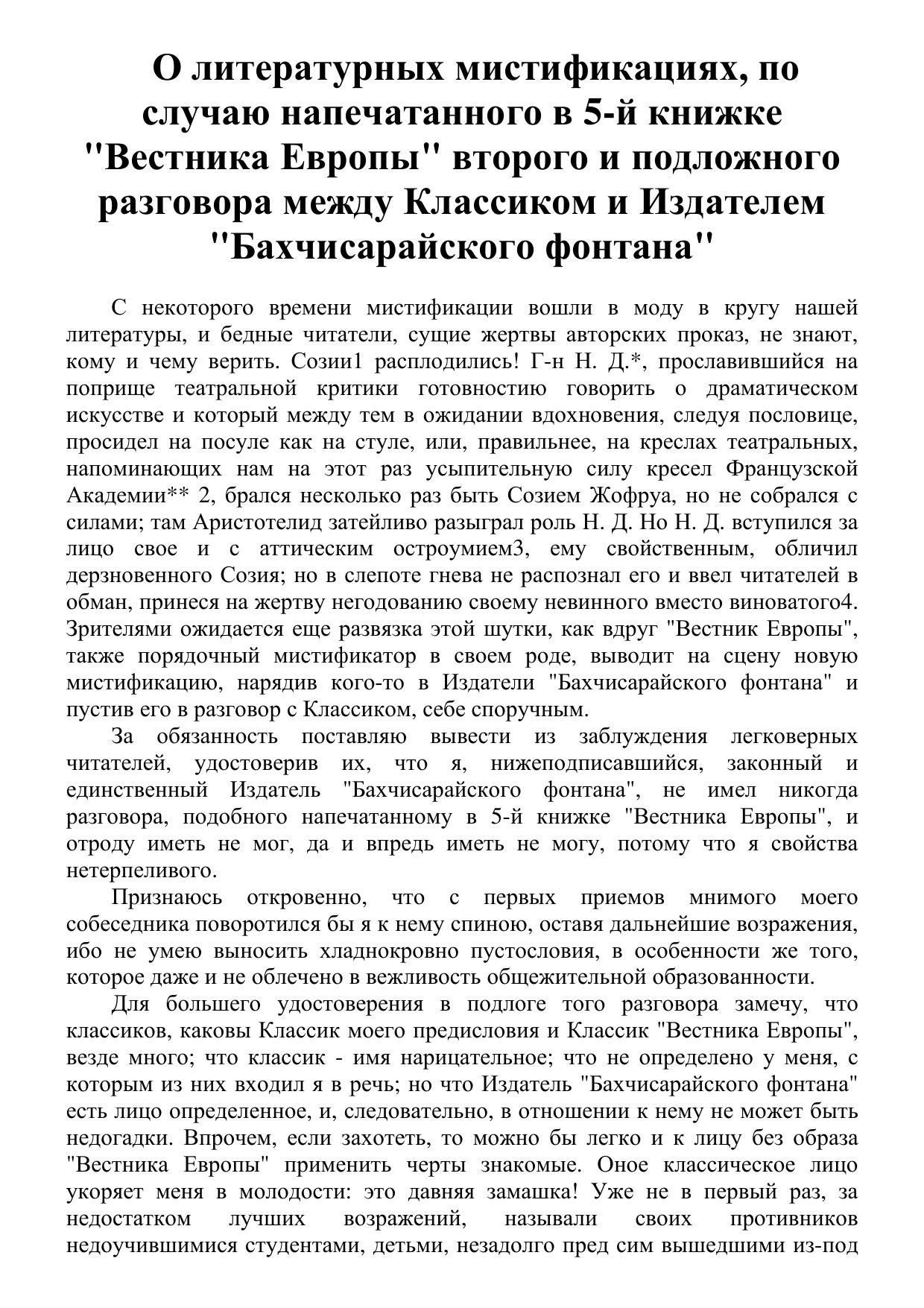 О литературных мистификациях, по случаю напечатанного в 5-й книжке "Вестника Европы" второго и подложного разговора между Классиком и Издателем "Бахчисарайского фонтана"