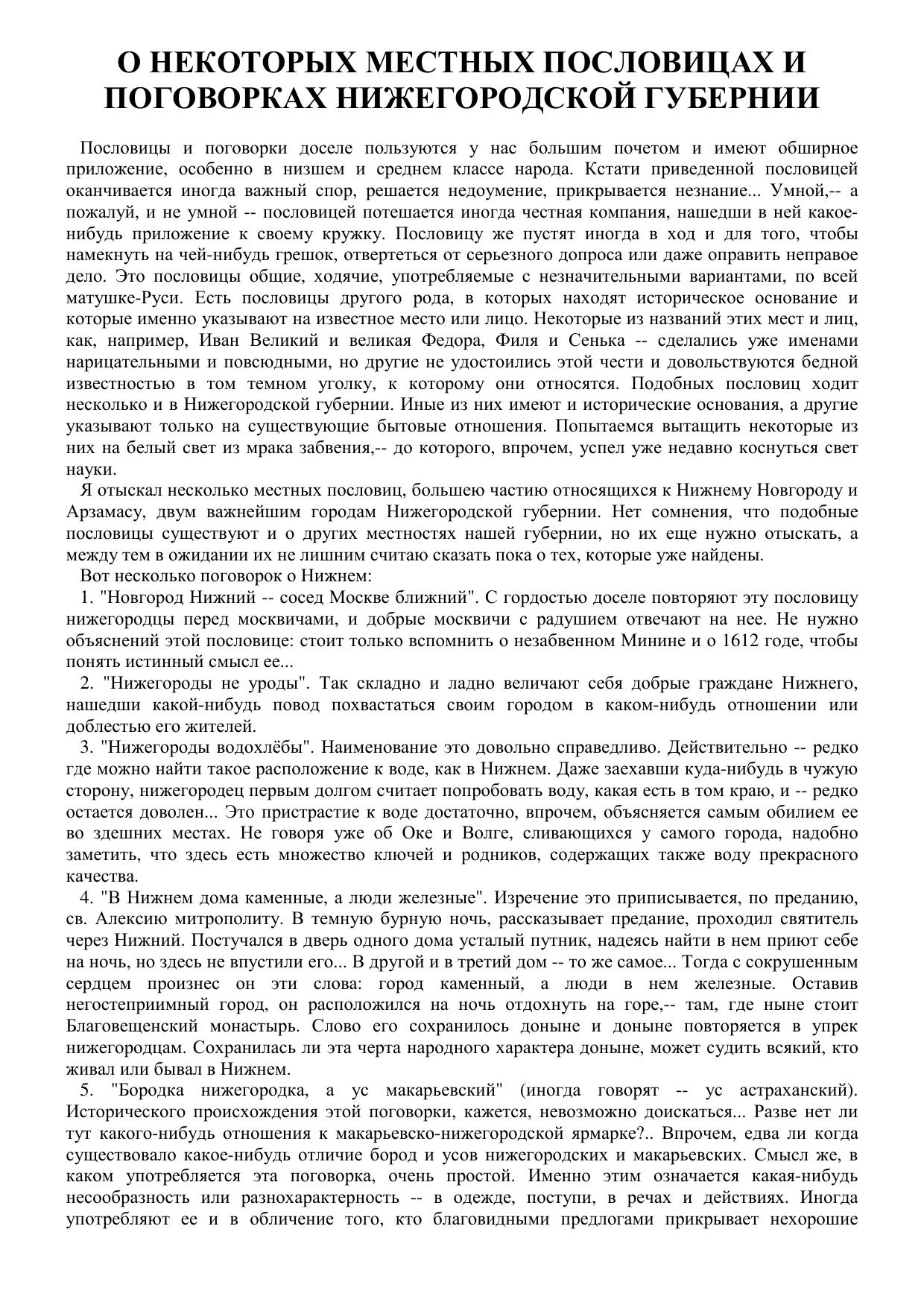 О некоторых местных пословицах и поговорках Нижегородской губернии