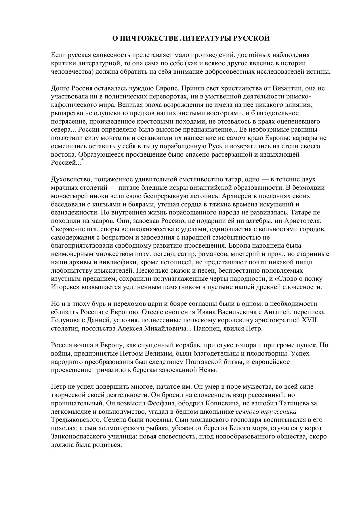О ничтожестве литературы русской