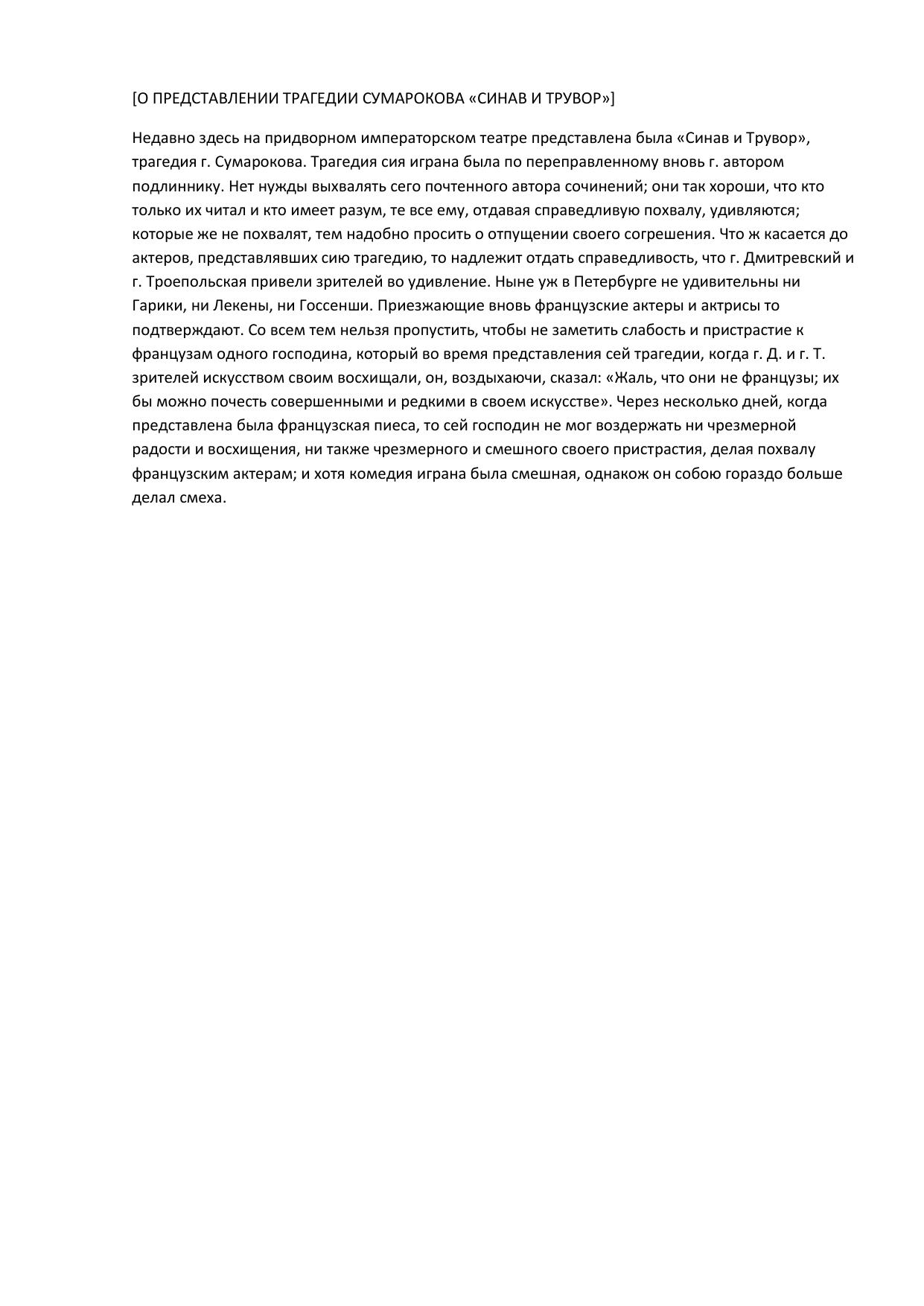 О представлении трагедии Сумарокова «Синав и Трувор»