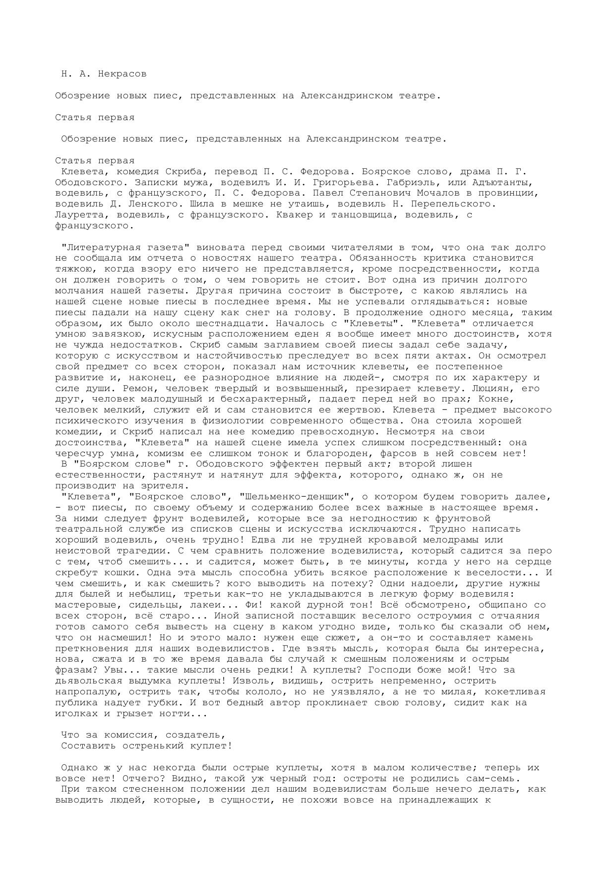 Обозрение новых пиес, представленных на Александринском театре. Статья первая