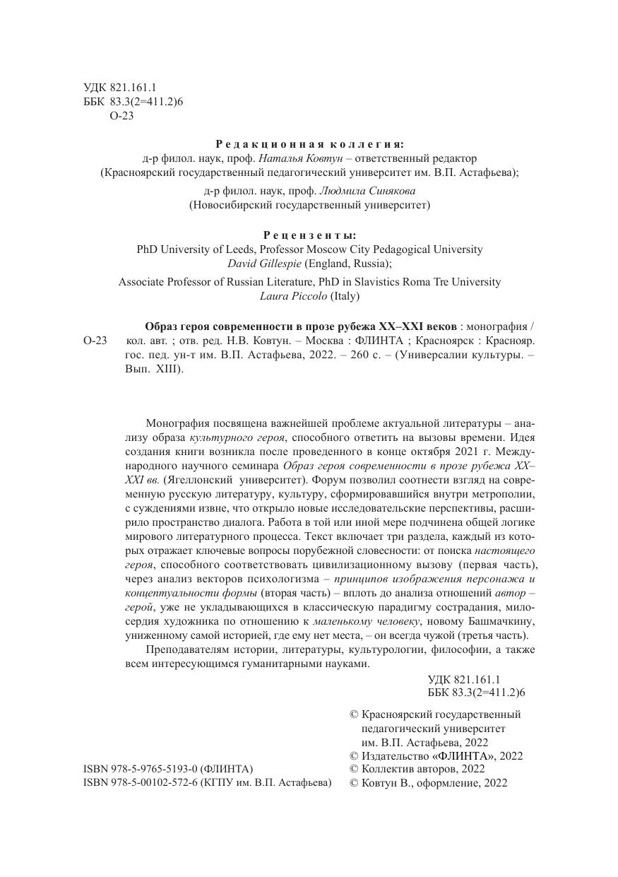 Монография посвящена важнейшей проблеме актуальной литературы – анализу образа культурного героя, способного ответить на вызовы времени. Идея создания книги возникла после проведенного в конце октября 2021 г. Международного научного семинара Образ героя современности в прозе рубежа ХХ–ХХI вв. (ягеллонский университет). Форум позволил соотнести взгляд на современную русскую литературу, культуру, сформировавшийся внутри метрополии, с суждениями извне, что открыло новые исследовательские перспективы, расширило пространство диалога. Работа в той или иной мере подчинена общей логике мирового литературного процесса. Текст включает три раздела, каждый из которых отражает ключевые вопросы порубежной словесности: от поиска настоящего героя, способного соответствовать цивилизационному вызову (первая часть), через анализ векторов психологизма – принципов изображения персонажа и концептуальности формы (вторая часть) – вплоть до анализа отношений автор – герой, уже не укладывающихся в классическую парадигму сострадания, милосердия художника по отношению к маленькому человеку, новому башмачкину, униженному самой историей, где ему нет места, – он всегда чужой (третья часть).