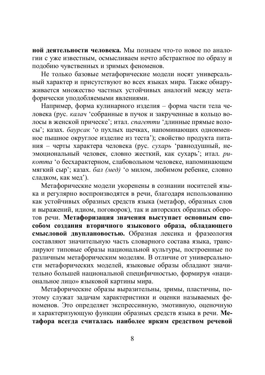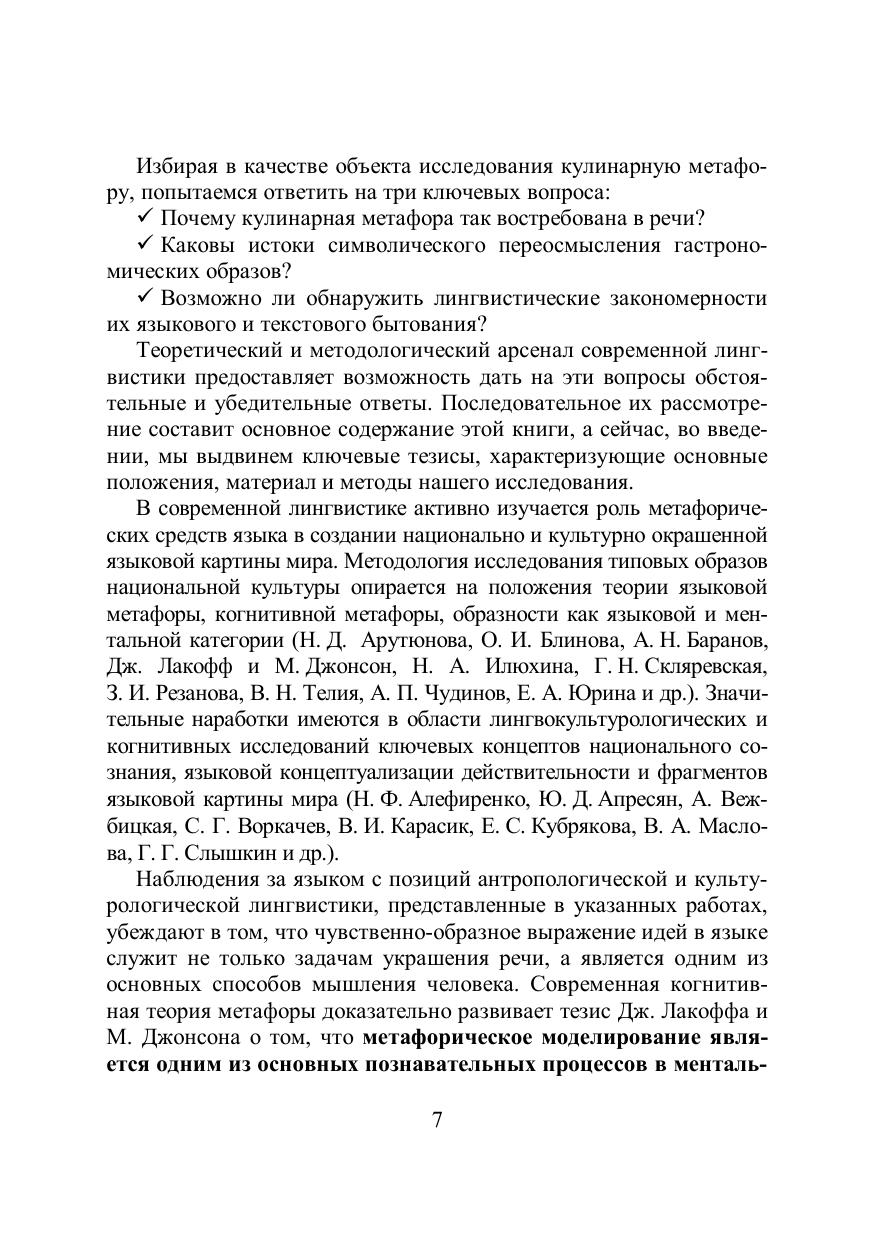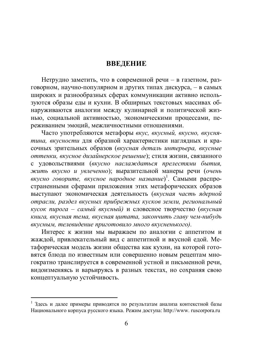 Учебное пособие посвящено исследованию реализации кулинарной метафоры в образном строе языка и ее функционированию в современных дискурсивных практиках. Освещаются лексико-семантический, когнитивно-дискурсивный, лингвокультурологический и лексикографический аспекты изучения образной лексики и фразеологии, характеризующей различные сферы действительности по аналогии со сферой еды и гастрономической деятельностью. Рассматриваются образные поля и лексико-фразеологические парадигмы, выражающие кулинарные образы, с точки зрения их структуры и участия в процессах коммуникации и миромоделирования. Для специалистов по лексикологии и фразеологии, семантике, лингвокультурологии, лексикографии, для преподавателей, аспирантов и студентов филологических факультетов, а также для всех, кого интересует эстетическая сфера родного языка.