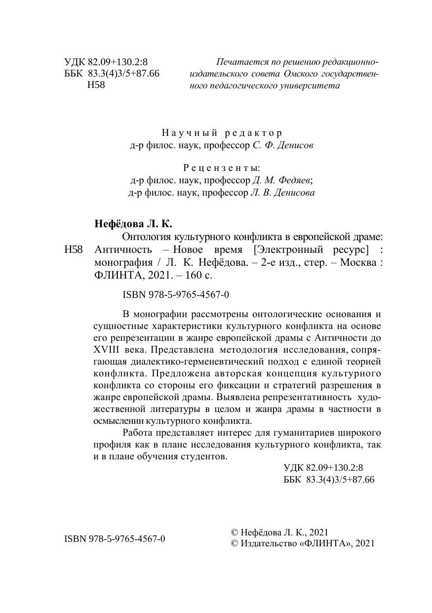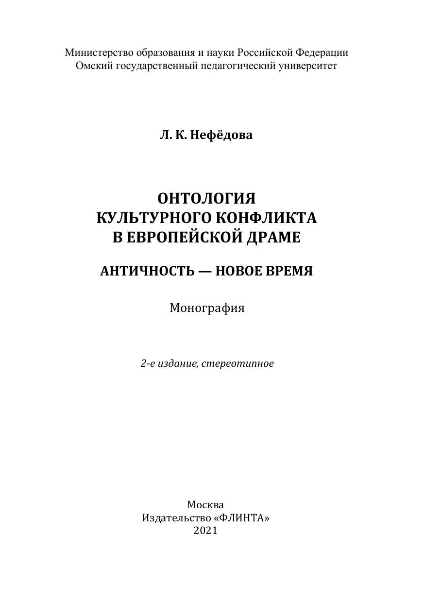 В монографии рассмотрены онтологические основания и сущностные характеристики культурного конфликта на основе его репрезентации в жанре европейской драмы с Античности до XVIII века. Представлена методология исследования, сопрягающая диалектико-герменевтический подход с единой теорией конфликта. Предложена авторская концепция культурного конфликта со стороны его фиксации и стратегий разрешения в жанре европейской драмы. Выявлена репрезентативность художественной литературы в целом и жанра драмы в частности в осмыслении культурного конфликта.