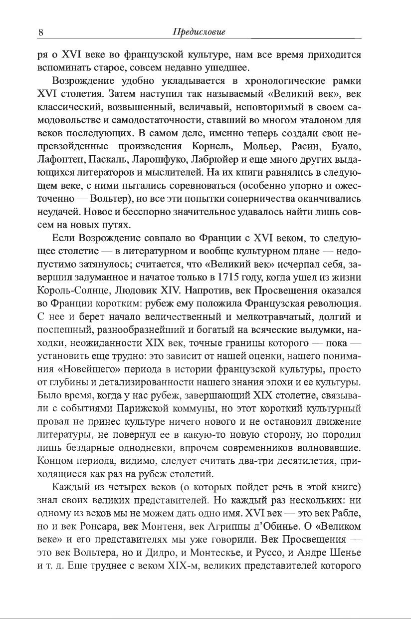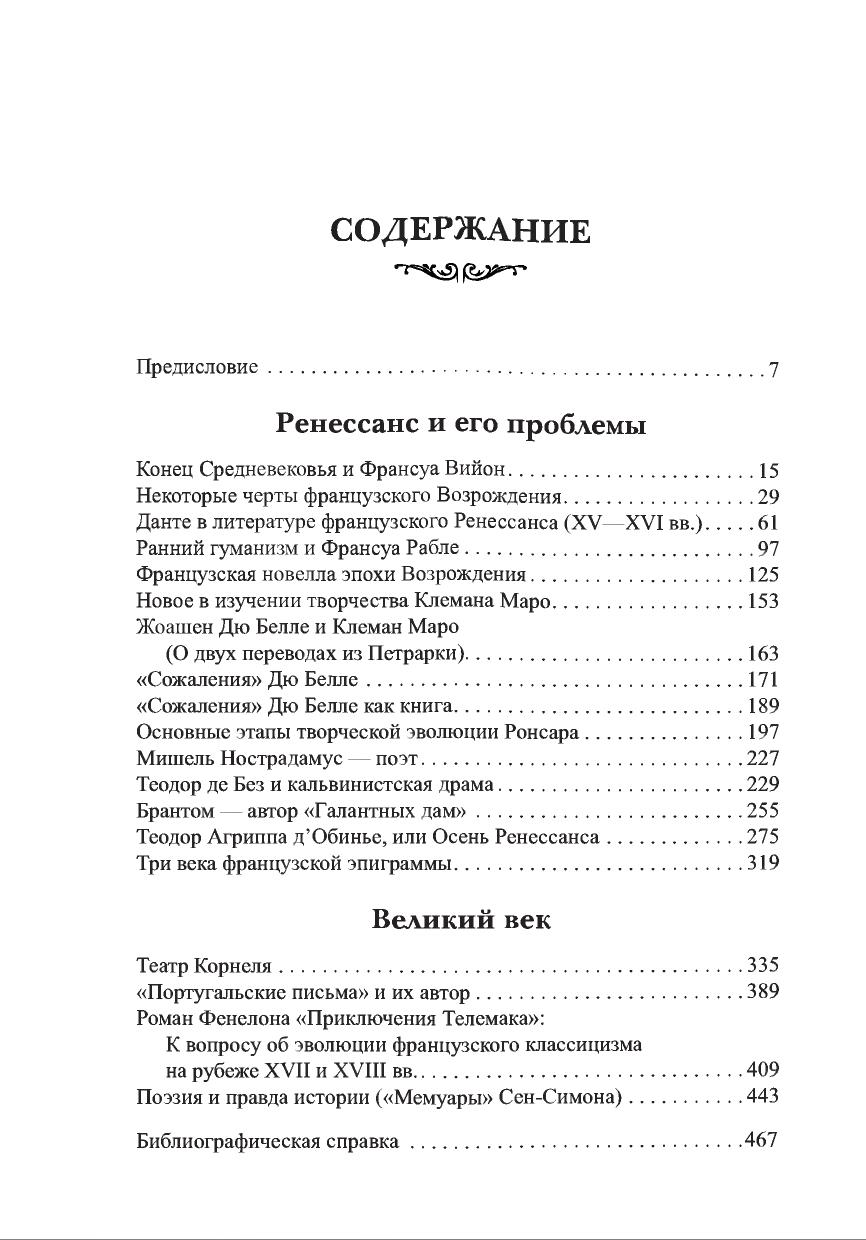 В книге собраны статьи, написанные в разное время (начиная с 60-х годов), но посвященные в какой-то мере одной теме —основным моментам развития французской литературы эпохи Возрождения и Семнадцатого столетия (то есть особенностям и закономерностям протекания литературного процесса). Здесь есть статьи обобщающего характера, статьи, посвященные творческому пути крупнейших представителей литературы этого времени (Вийон, Рабле, Ронсар, Агриппа д’Обинье, Корнель и др.), проблемам переходных эпох и некоторым частным вопросам, важным для характеристики движения литературы на протяжении более чем двух веков.