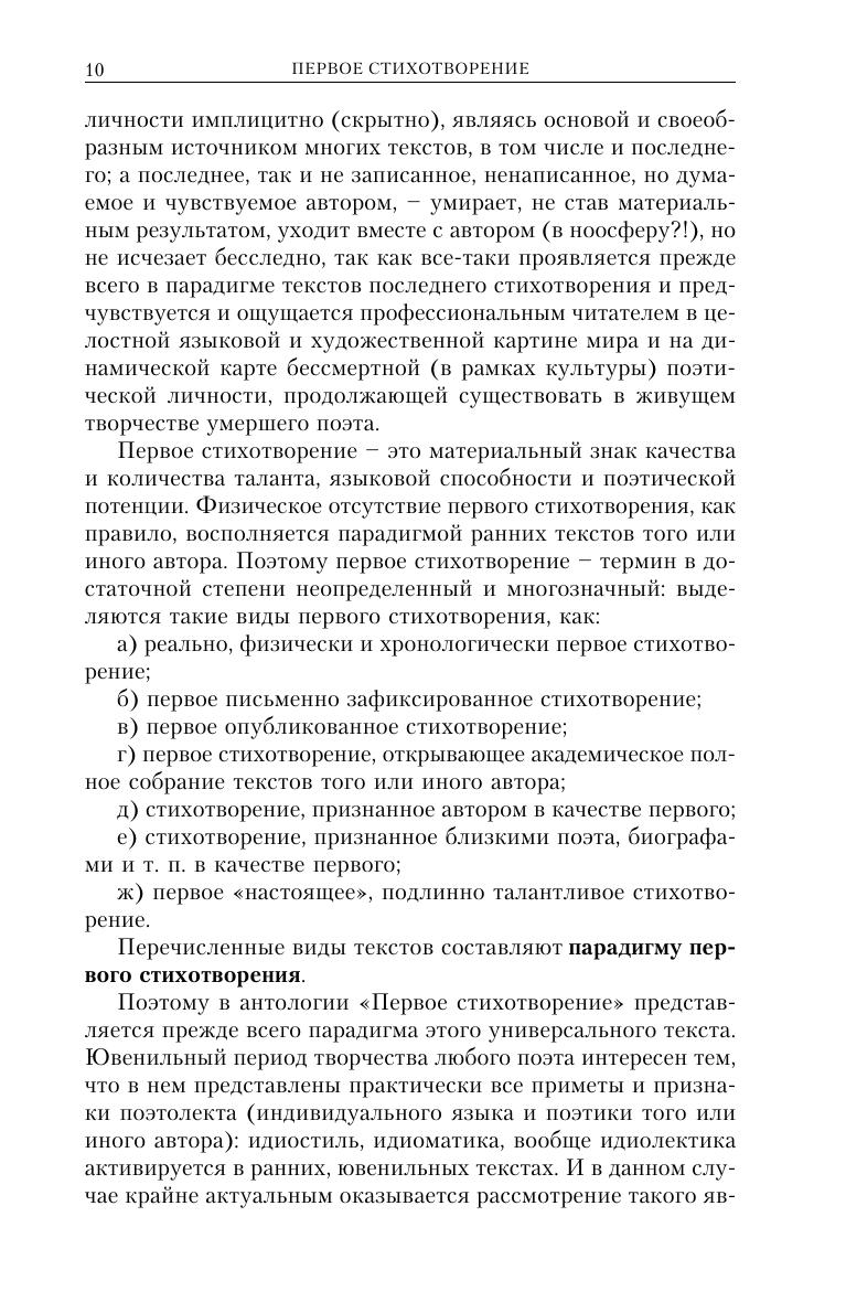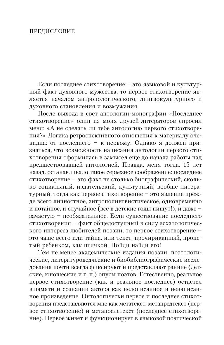 Книга включает в себя две поэтические антологии и в целом представляет собой приложение к антологии-монографии «Последнее стихотворение». Антология «Первое стихотворение» содержит в себе ранние стихотворные опыты и ювенильные стихотворения более ста поэтов XVIII-XXI вв., а также краткие биографические сведения об авторах и поэтологическую информацию, касающуюся начального периода творчества каждого из них. Стихи, представленные в антологии «Мое стихотворение», создают поэтологический портрет современного читателя, раскрывают поэтические пристрастия и привязанности человека XX-XXI вв. Адресована всем, кто любит русскую изящную словесность.