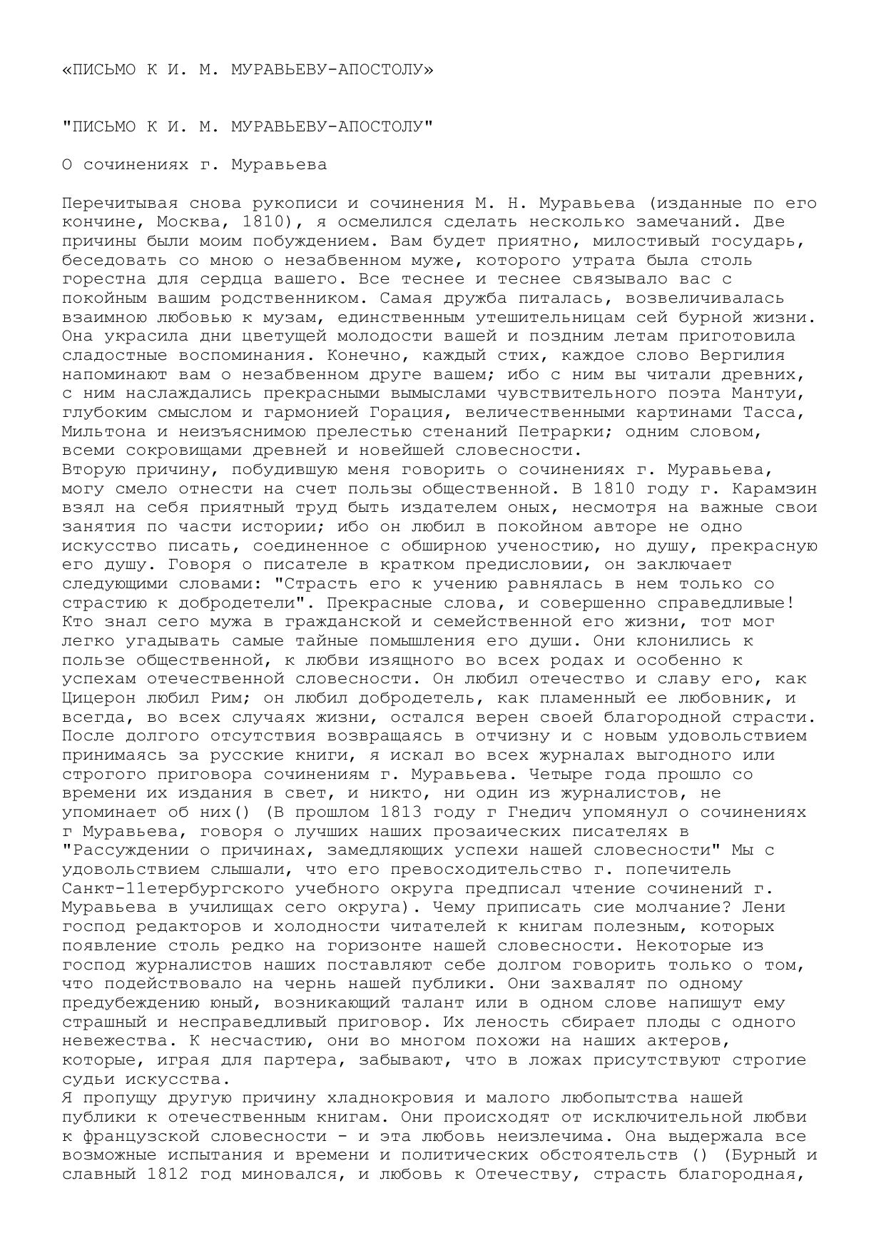 Письмо к И. М. М (уравьеву) -А(постолу). О сочинениях г. Муравьева