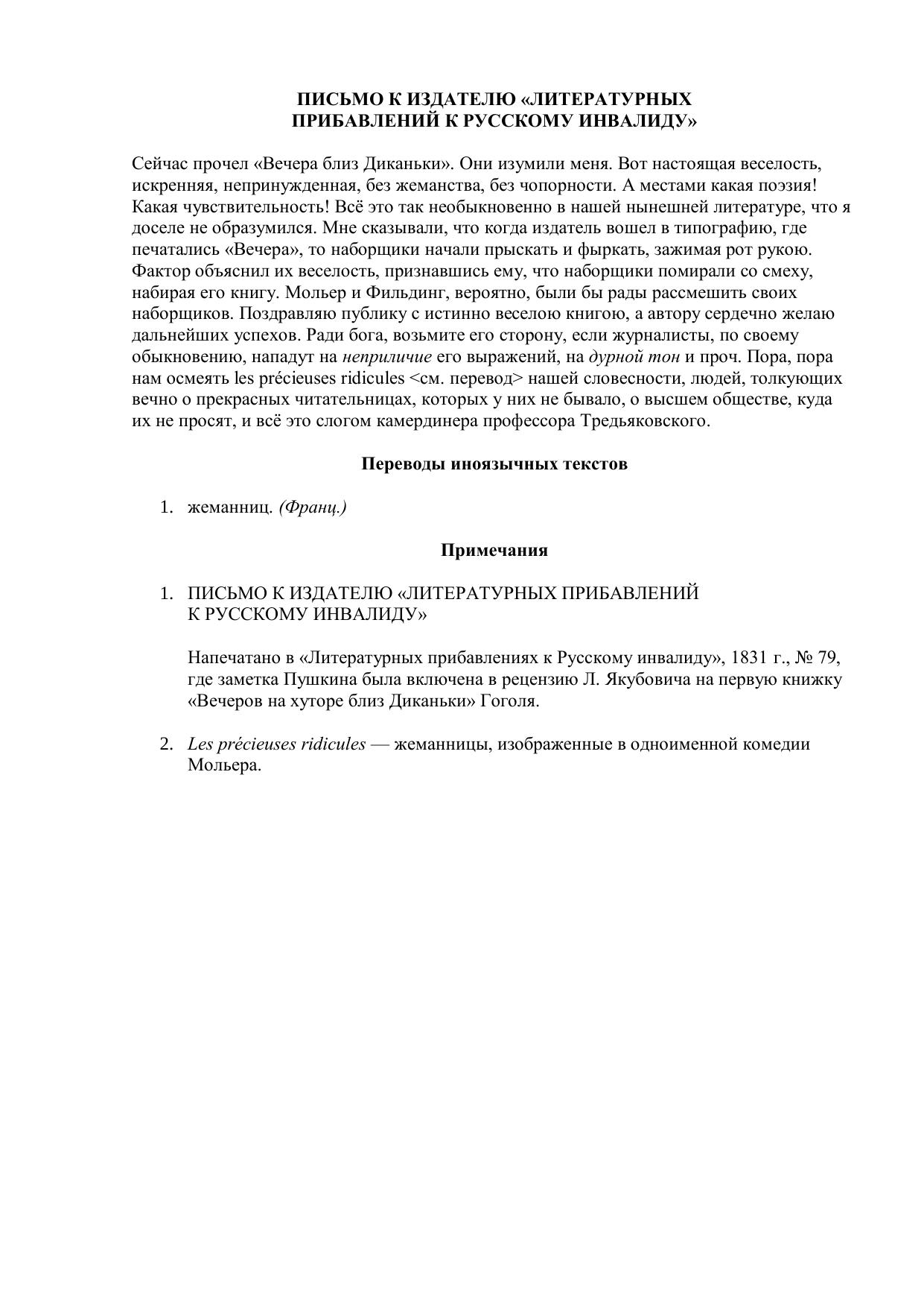 Письмо к издателю "Литературных прибавлений к Русскому инвалиду"
