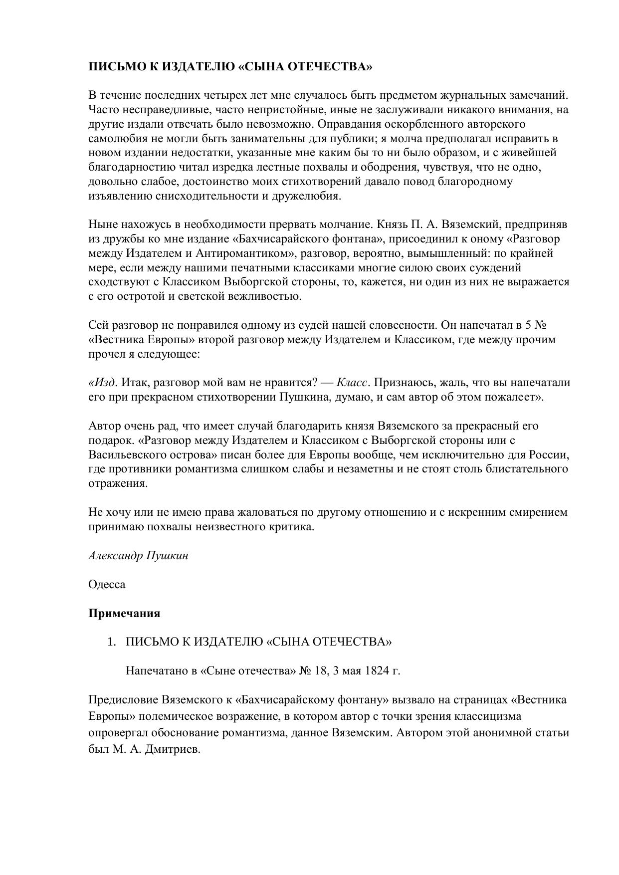 Письмо к издателю "Сына отечества"