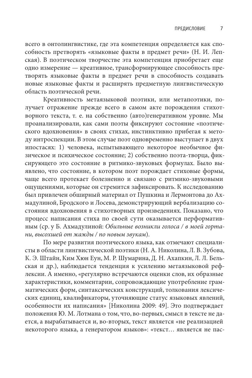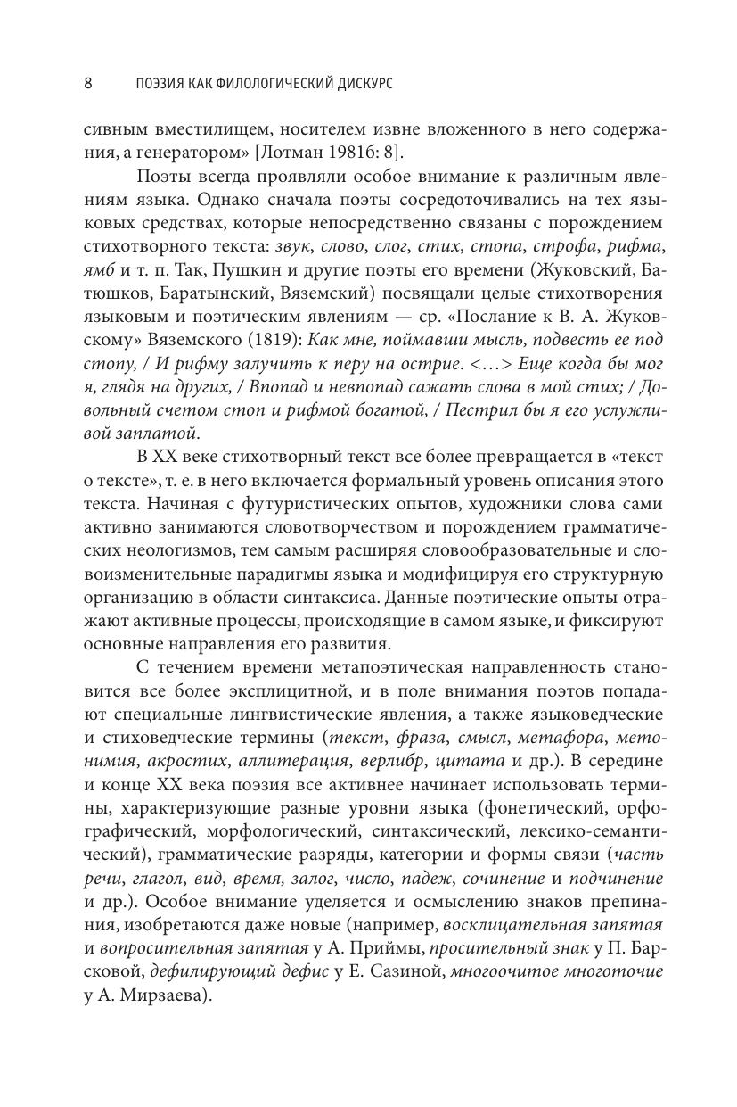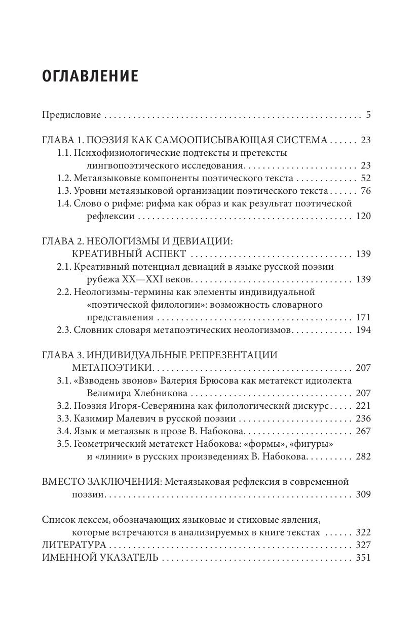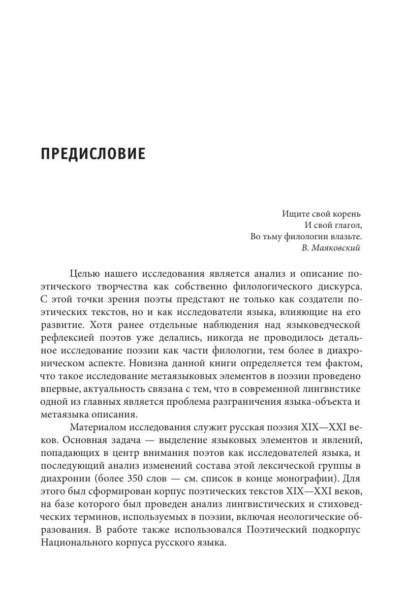 В монографии представлено описание поэтического творчества как собственно филологического дискурса: а именно, в ней изучается, как в поэзии используются лингвистические, стиховедческие термины и слова, связанные с порождением текста. В книге анализируются динамические процессы, происходящие в составе этой целостной лексической группы на протяжении XIX—XXI вв. Выделенные единицы, с одной стороны, рассматриваются как элементы текста, а с другой — как элементы метатекста. С этой точки зрения поэзия предстает как самоописывающая система, а поэты выступают не только как создатели поэтических текстов, но и как исследователи языка, влияющие на его развитие. Как еще одно проявление мета-языковой функции в книге описываются языковые девиации и неологизмы разных уровней, в результате чего предлагается создание «Словаря метапоэтических неологизмов». В монографии также специально изучается идиостилевой аспект использования определенных лингвопоэтических терминов и слов, связанных с текстопорождением, — в этом аспекте анализируются идиостили В. Хлебникова, В. Брюсова, И. Северянина, В. Набокова, очерчивается творческая манера К. Малевича не только как художника, но и как поэта-философа. Книга предназначена для представителей гуманитарных профессий — филологов, философов, психологов, искусствоведов, культурологов, а также всех любителей изящной словесности.