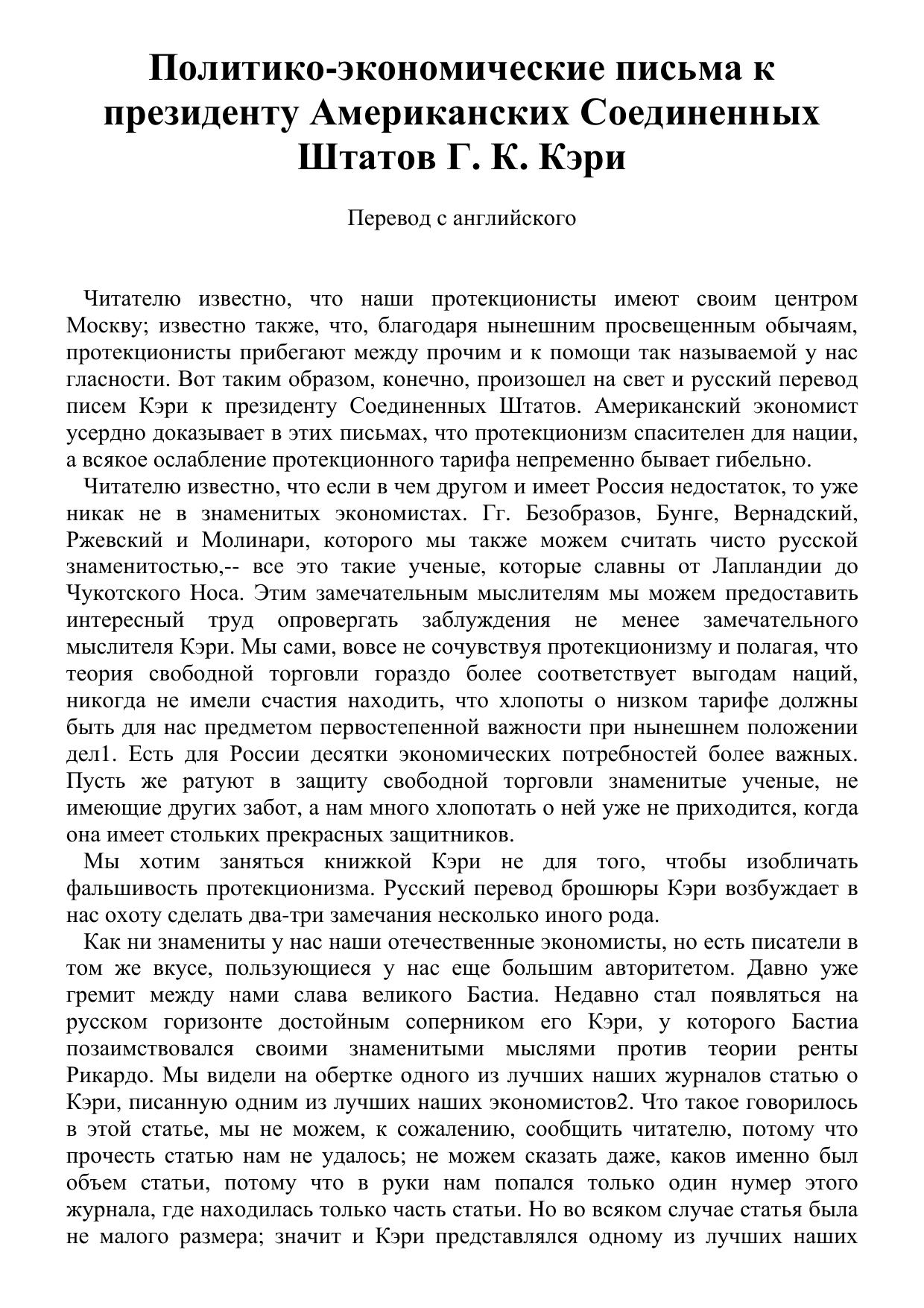Политико-экономические письма к президенту Американских Соединенных Штатов Г. К. Кэри