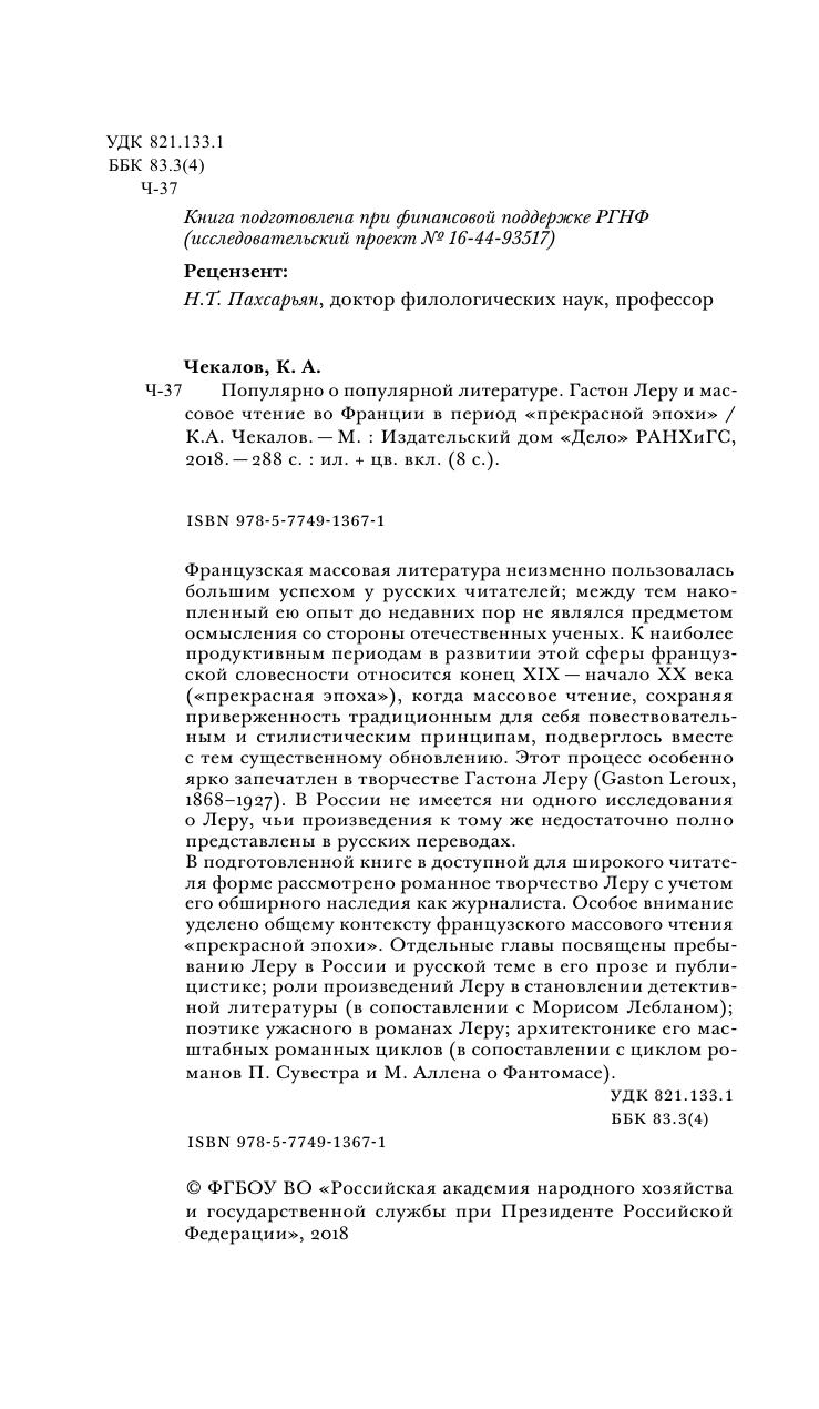 НЕЗАКОННОЕ ПОТРЕБЛЕНИЕ НАРКОТИЧЕСКИХ СРЕДСТВ, ПСИХОТРОПНЫХ ВЕЩЕСТВ, ИХ АНАЛОГОВ ПРИЧИНЯЕТ ВРЕД ЗДОРОВЬЮ, ИХ НЕЗАКОННЫЙ ОБОРОТ ЗАПРЕЩЕН И ВЛЕЧЕТ УСТАНОВЛЕННУЮ ЗАКОНОДАТЕЛЬСТВОМ ОТВЕТСТВЕННОСТЬ. Французская массовая литература неизменно пользовалась большим успехом у русских читателей, между тем накопленный ею опыт до недавних пор не являлся предметом осмысления со стороны отечественных ученых. К наиболее продуктивным периодам в развитии этой сферы французской словесности относится конец XIX — начало XX века («прекрасная эпоха»), когда массовое чтение, сохраняя приверженность традиционным для себя повествовательным и стилистическим принципам, подверглось вместе с тем существенному обновлению. Этот процесс особенно ярко запечатлен в творчестве Гастона Леру (Gaston Leroux, 1868–1927). В России не имеется ни одного исследования о Леру, чьи произведения к тому же недостаточно полно представлены в русских переводах. В подготовленной книге в доступной для широкого читателя форме рассмотрено романное творчество Леру с учетом его обширного наследия как журналиста. Особое внимание уделено общему контексту французского массового чтения «прекрасной эпохи». Отдельные главы посвящены пребыванию Леру в России и русской теме в его прозе и публицистике, роли произведений Леру в становлении детективной литературы (в сопоставлении с Морисом Лебланом), поэтике ужасного в романах Леру, архитектонике его масштабных романных циклов (в сопоставлении с циклом романов П. Сувестра и М. Аллена о Фантомасе).