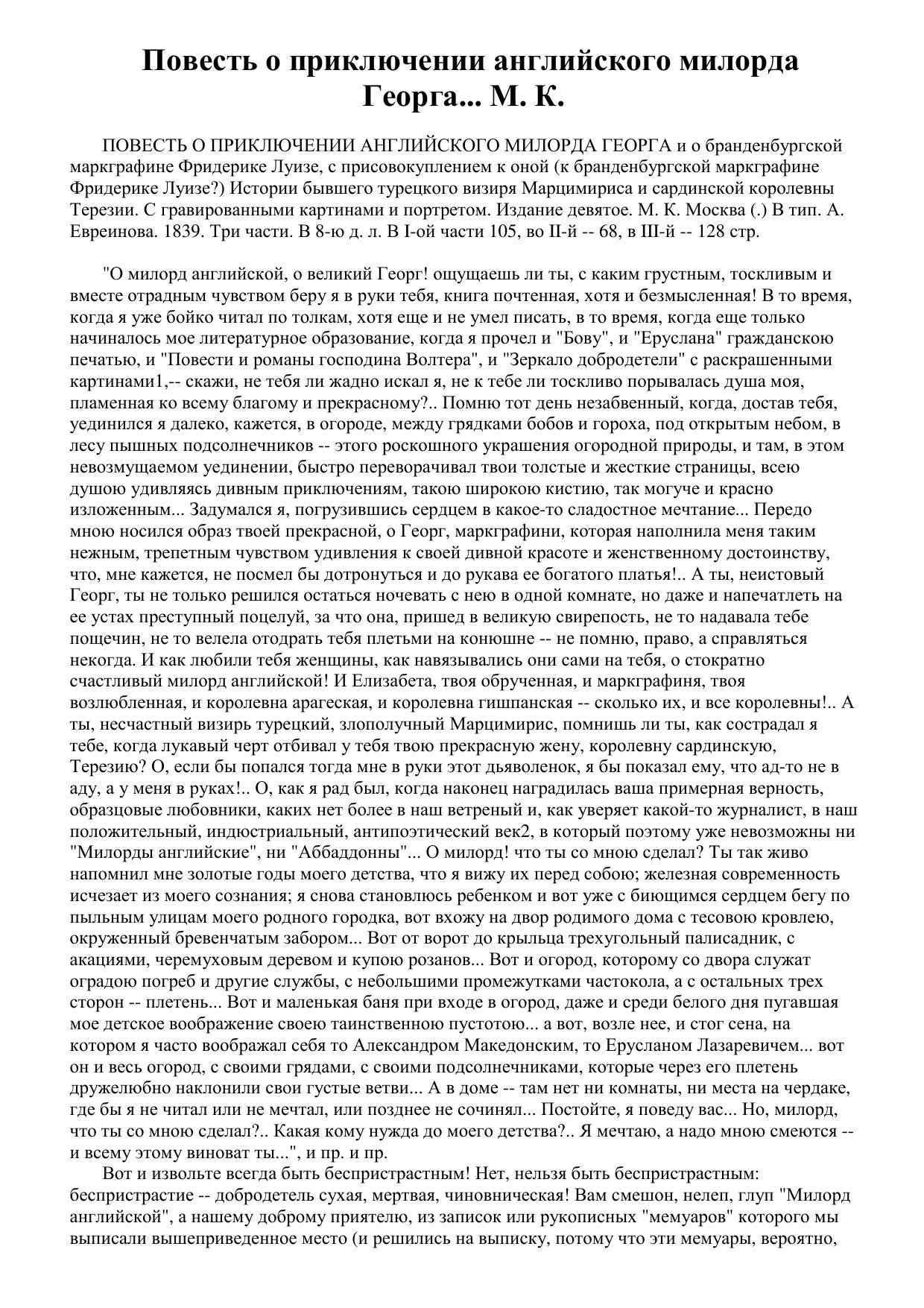 Повесть о приключении английского милорда Георга... М. К.