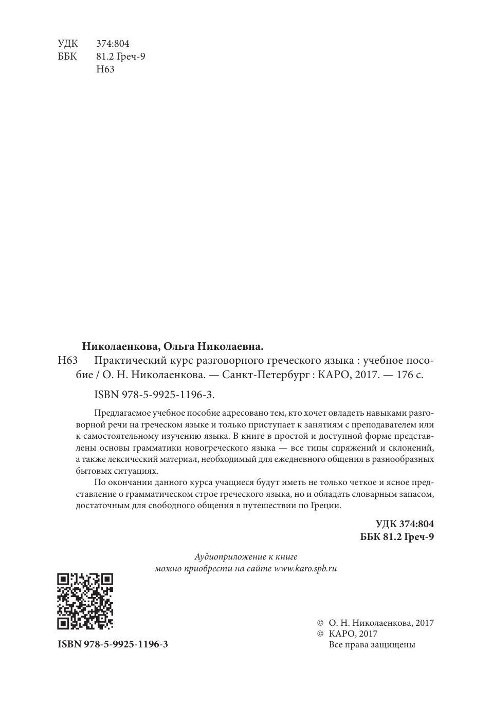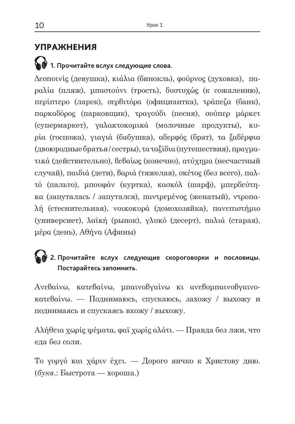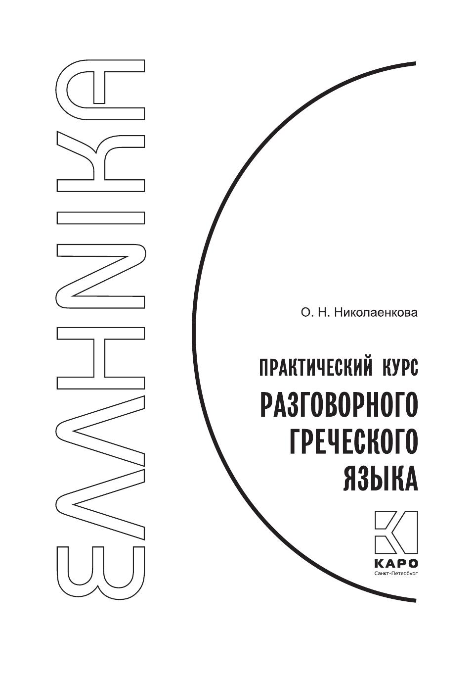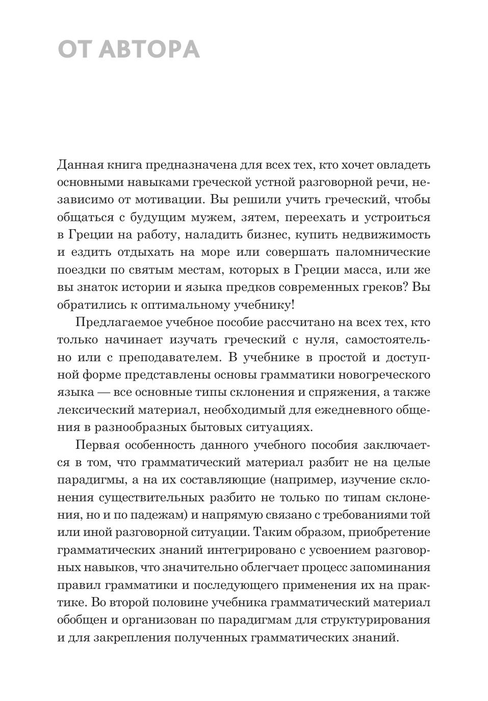 Предлагаемое учебное пособие адресовано тем, кто хочет овладеть навыками разговорной речи на греческом языке и только приступает к занятиям с преподавателем или к самостоятельному изучению языка. В книге в простой и доступной форме представлены основы грамматики новогреческого языка — все типы спряжений и склонений, а также лексический материал, необходимый для ежедневного общения в разнообразных бытовых ситуациях. По окончании данного курса учащиеся будут иметь не только четкое и ясное представление о грамматическом строе греческого языка, но и обладать словарным запасом, достаточным для свободного общения в путешествии по Греции.