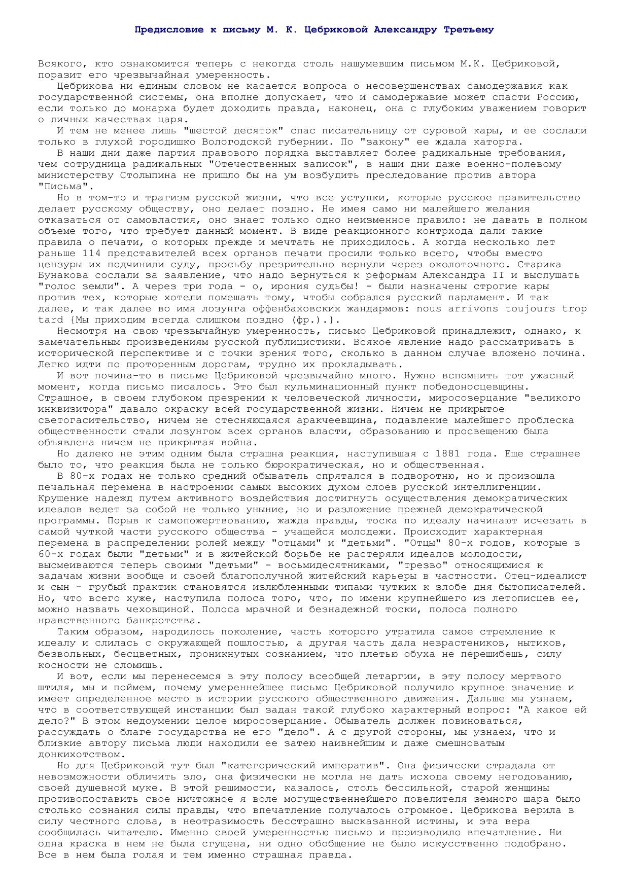 Предисловие к письму М. К. Цебриковой Александру Третьему
