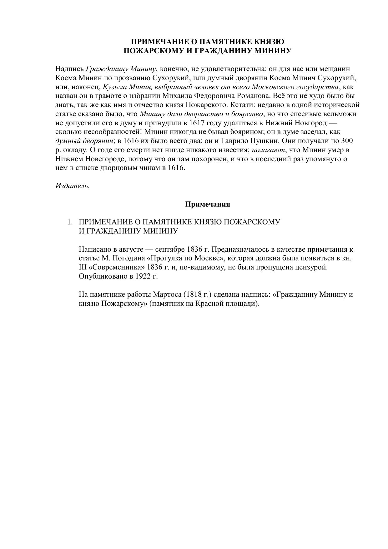 Примечание о памятнике князю Пожарскому и гражданину Минину