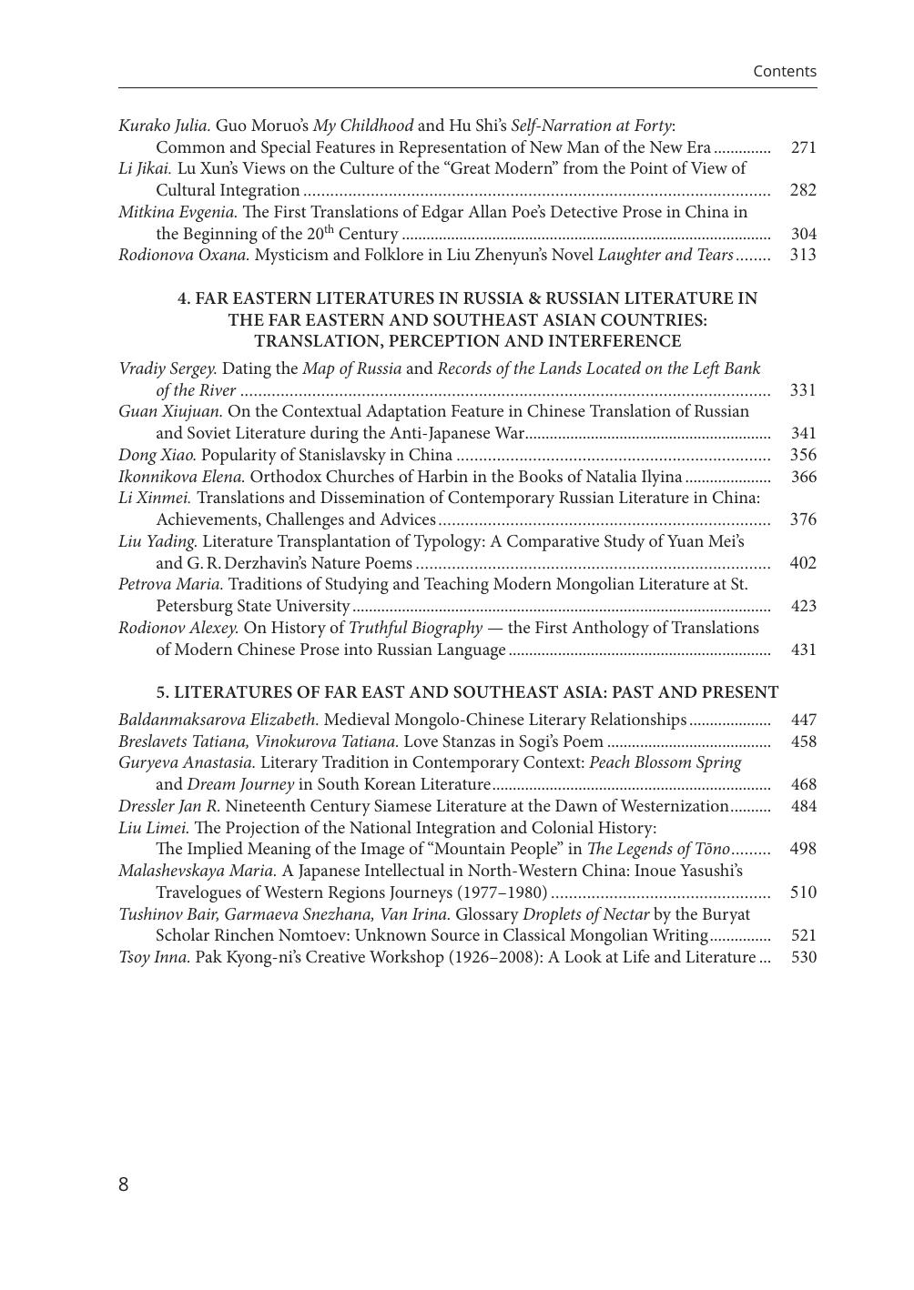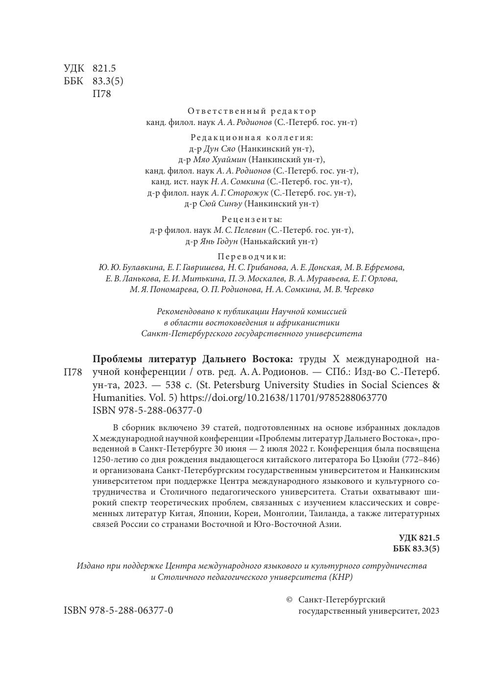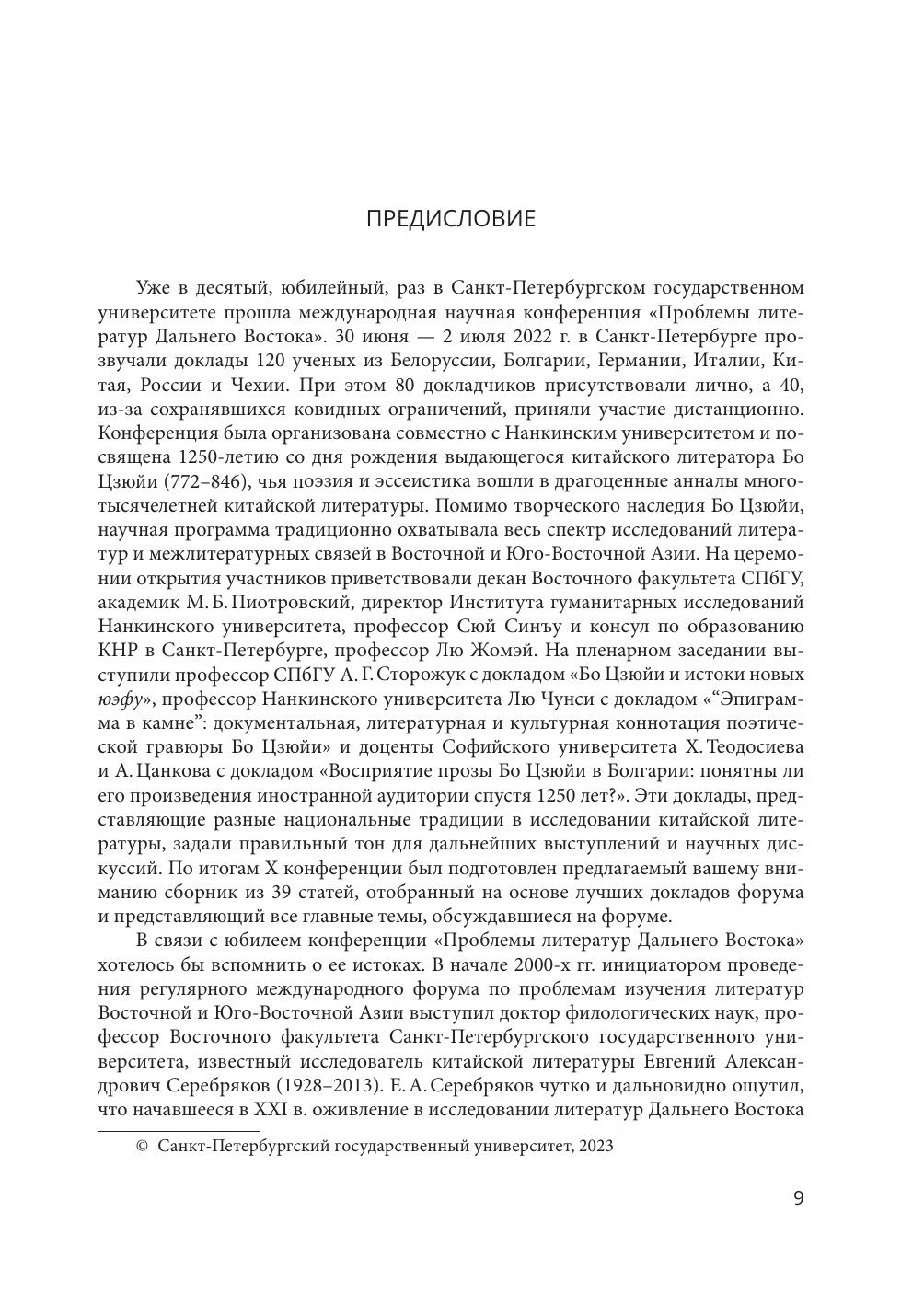 В сборник включено 39 статей, подготовленных на основе избранных докладов Х международной научной конференции "Проблемы литератур Дальнего Востока", проведенной в Санкт-Петербурге 30 июня - 2 июля 2022 г. Конференция была посвящена 1250-летию со дня рождения выдающегося китайского литератора Бо Цзюйи (772-846) и организована Санкт-Петербургским государственным университетом и Нанкинским университетом при поддержке Центра международного языкового и культурного сотрудничества и Столичного педагогического университета. Статьи охватывают широкий спектр теоретических проблем, связанных с изучением классических и современных литератур Китая, Японии, Кореи, Монголии, Таиланда, а также литературных связей России со странами Восточной и Юго-Восточной Азии.