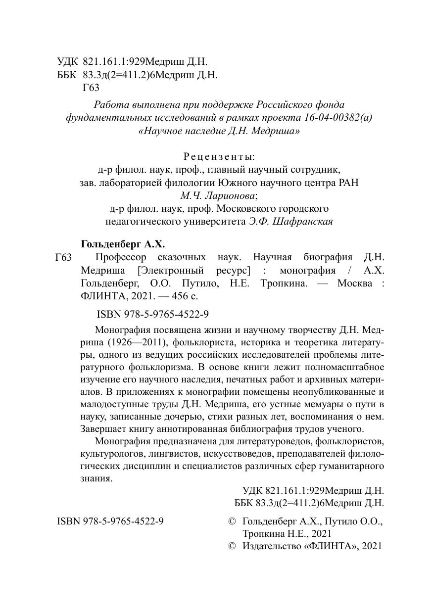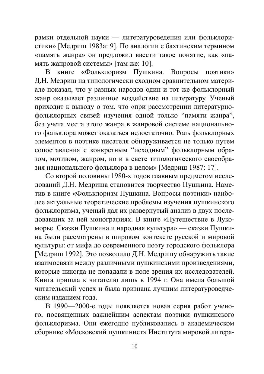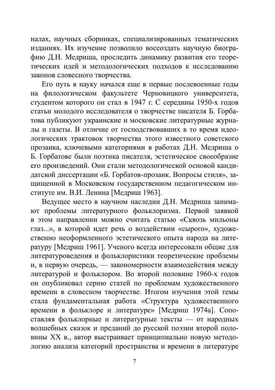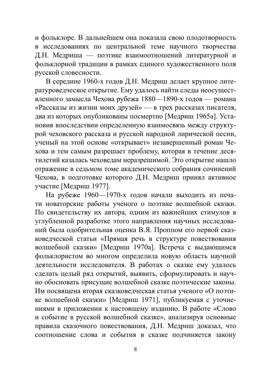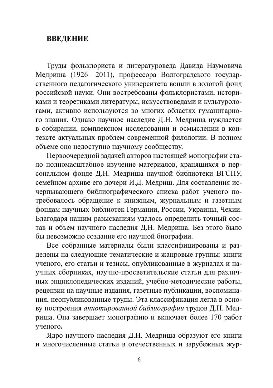 Монография посвящена жизни и научному творчеству Д.Н. Медриша (1926—2011), фольклориста, историка и теоретика литературы, одного из ведущих российских исследователей проблемы литературного фольклоризма. В основе книги лежит полномасштабное изучение его научного наследия, печатных работ и архивных материалов. В приложениях к монографии помещены неопубликованные и малодоступные труды Д.Н. Медриша, его устные мемуары о пути в науку, записанные дочерью, стихи разных лет, воспоминания о нем. Завершает книгу аннотированная библиография трудов ученого.