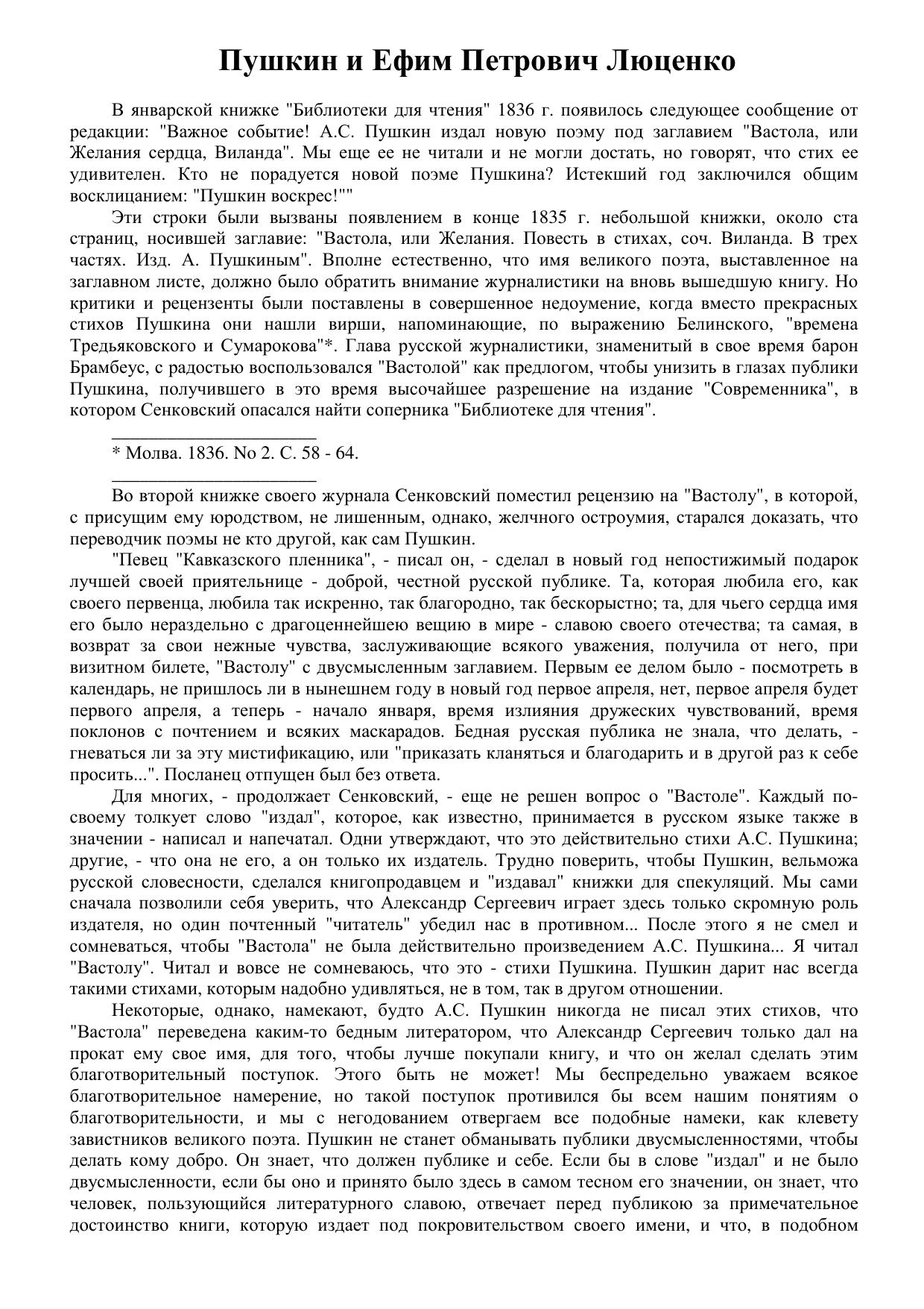 Пушкин и Ефим Петрович Люценко