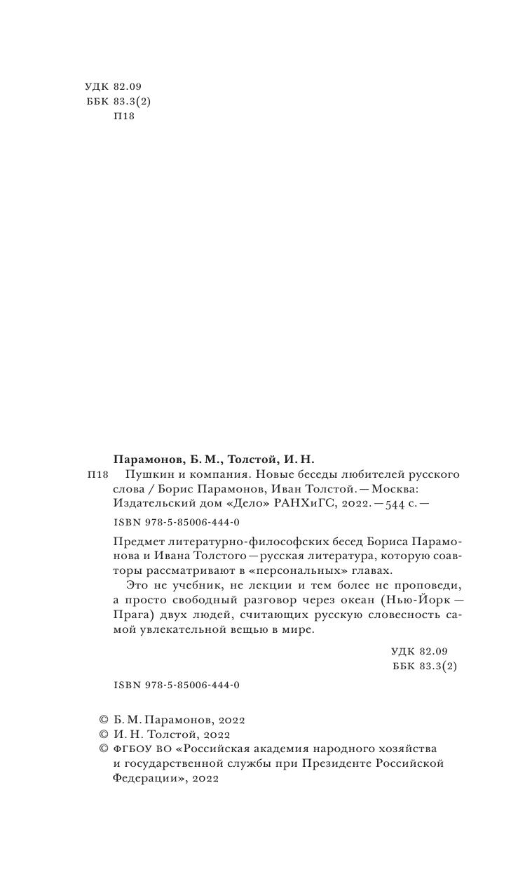 Предмет литературно-философских бесед Бориса Парамонова и Ивана Толстого — русская литература, которую соавторы рассматривают в «персональных» главах. Это не учебник, не лекции и тем более не проповеди, а просто свободный разговор через океан (Нью-Йорк — Прага) двух людей, считающих русскую словесность самой увлекательной вещью в мире.