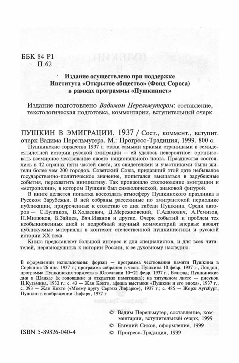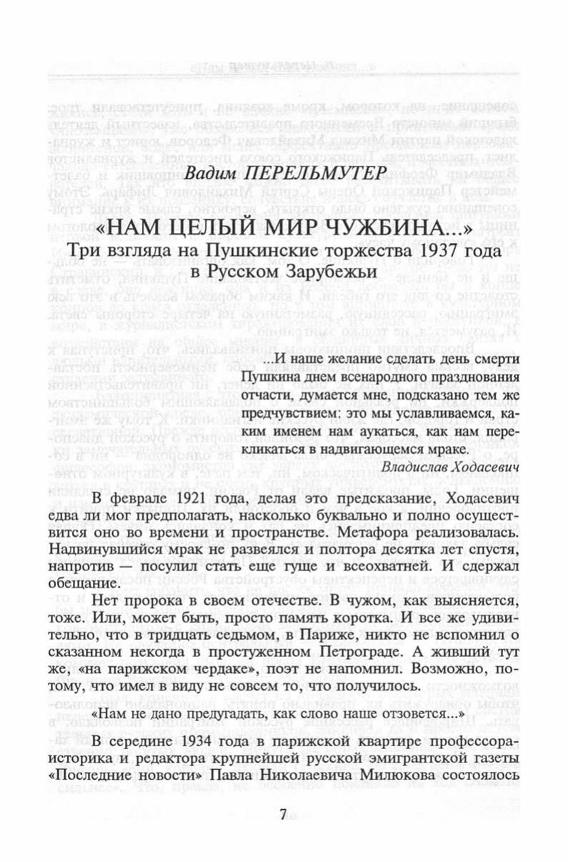 Пушкинские торжества 1937 г. стали самыми яркими страницами в семидесятилетней истории русской эмиграции — ей удалось невероятное: организовать всемирное чествование своего национального поэта. Празднества состоялись в 42 странах пяти частей света, их свидетелями и участниками были жители более чем 200 городов. Советский Союз, придавший этой дате небывалое государственно-политическое значение, попытался вмешаться в зарубежные события, перехватить инициативу. Так произошло столкновение эмиграции и "метрополии", в котором Пушкин был символической, знаковой фигурой.