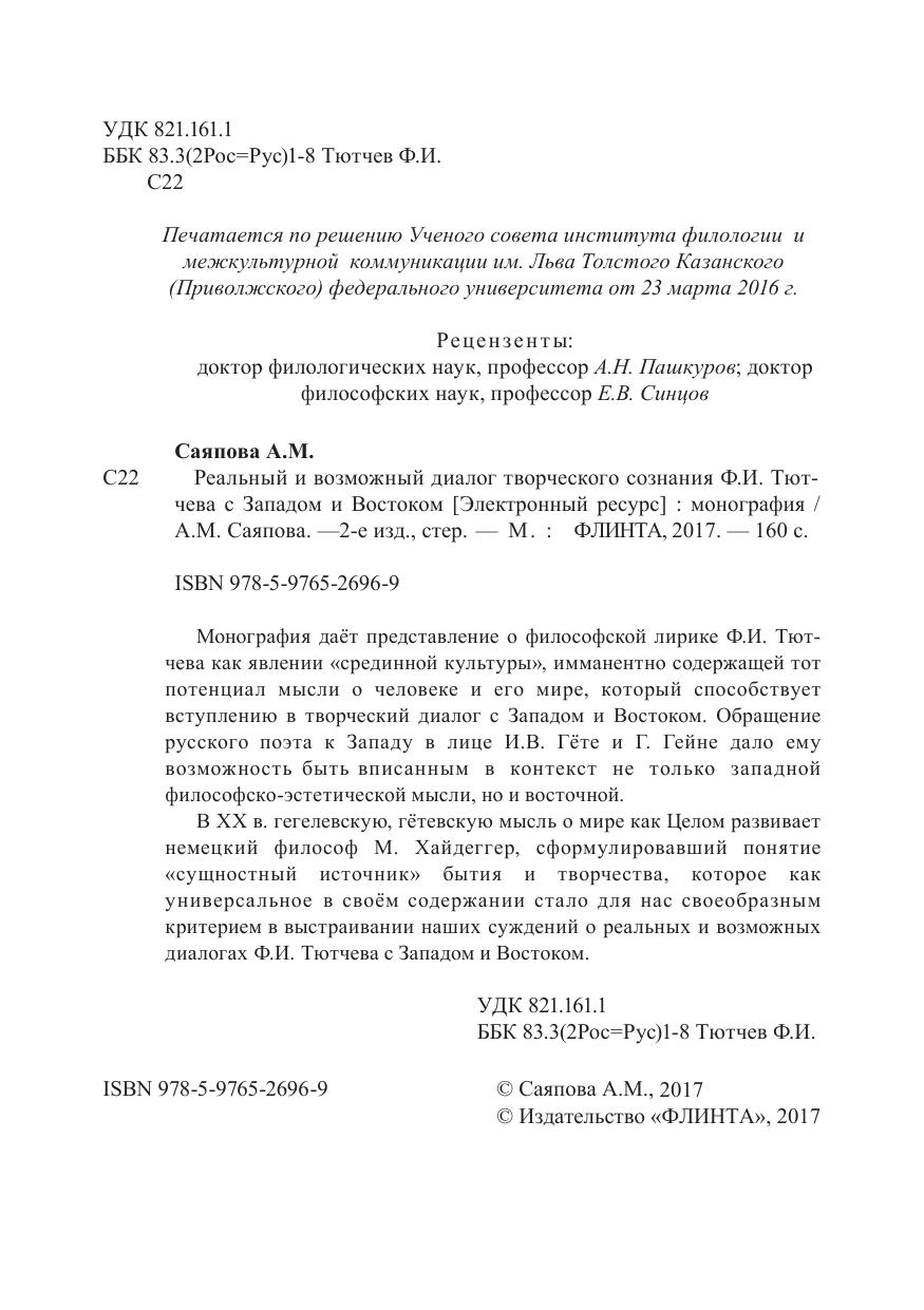 Монография даёт представление о философской лирике Ф.И. Тютчева как явлении «срединной культуры», имманентно содержащей тот потенциал мысли о человеке и его мире, который способствует вступлению в творческий диалог с Западом и Востоком. Обращение русского поэта к Западу в лице И.В. Гёте и Г. Гейне дало ему возможность быть вписанным в контекст не только западной философско-эстетической мысли, но и восточной.