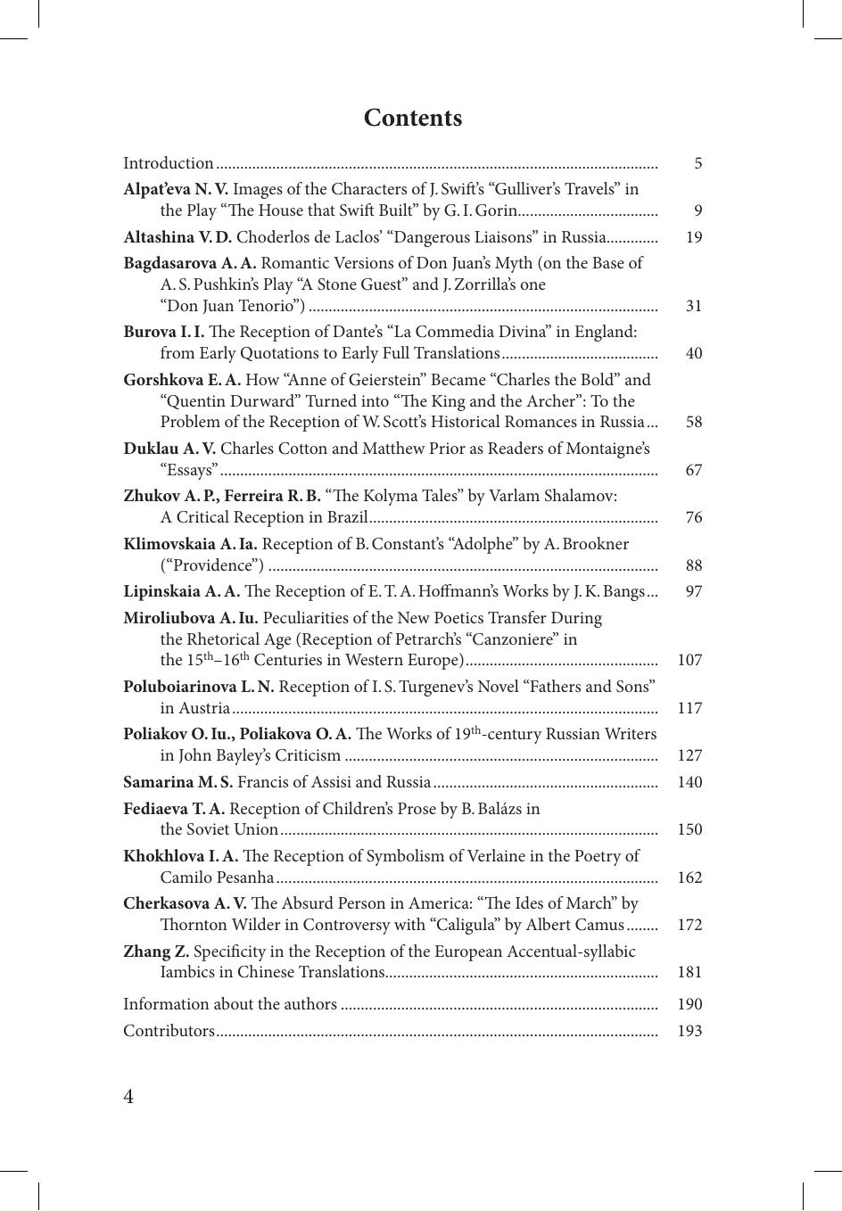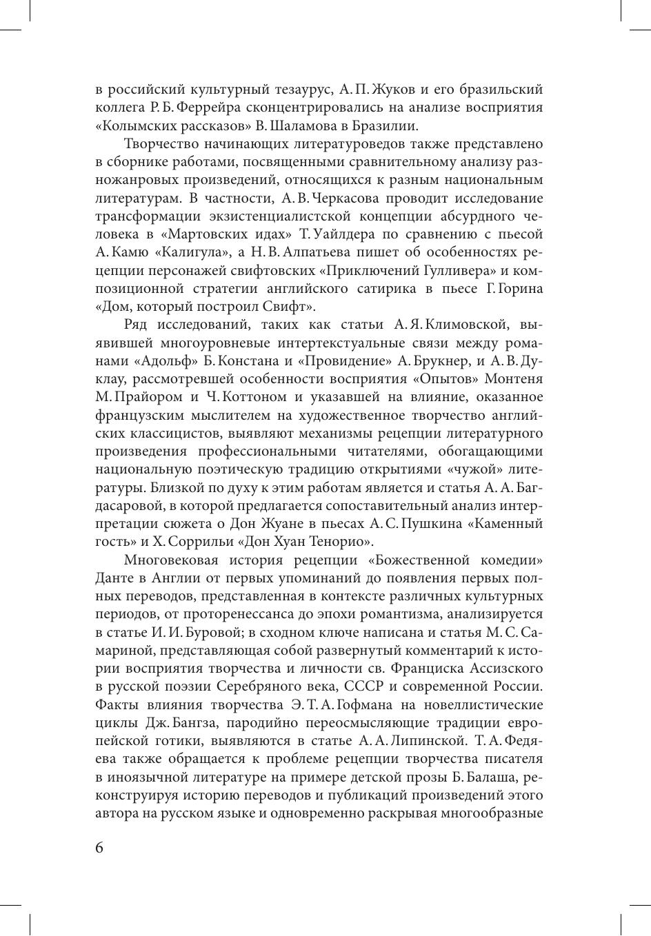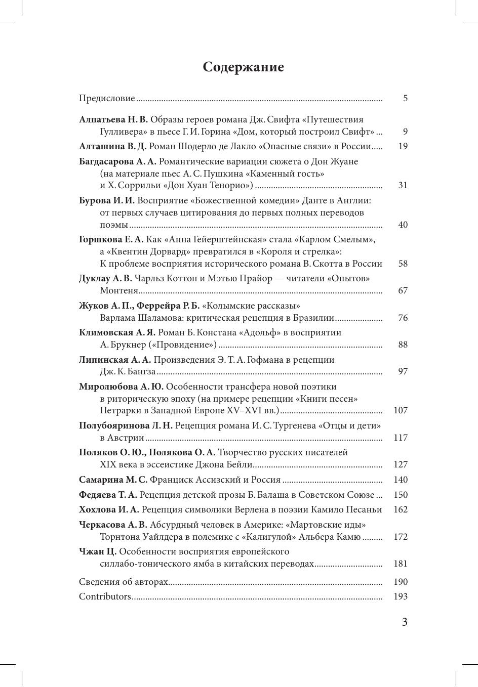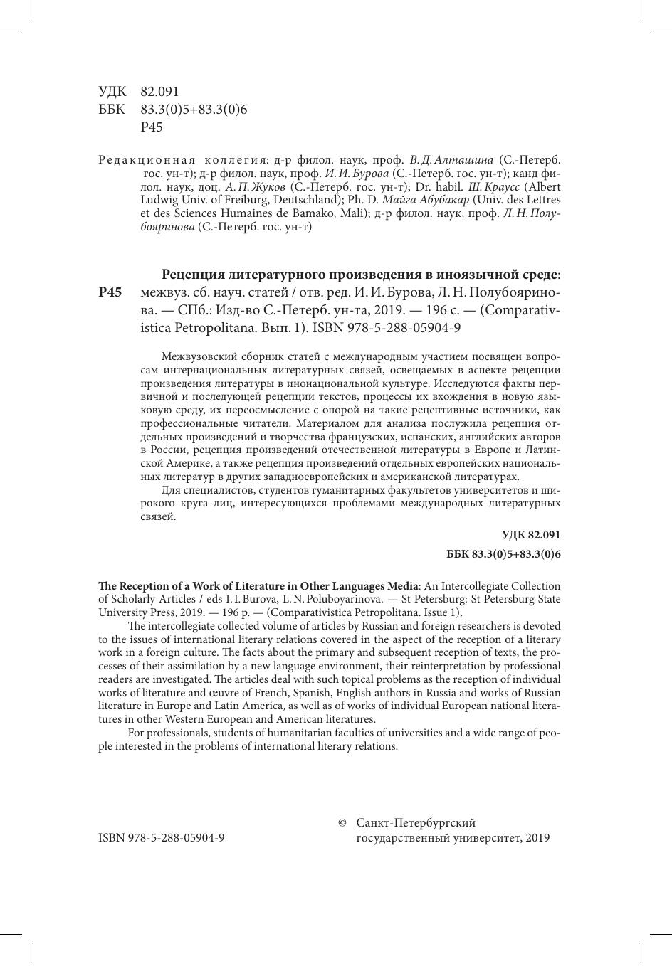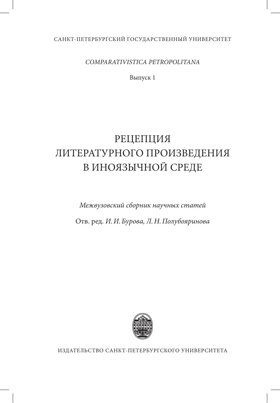 Межвузовский сборник статей с международным участием посвящен вопросам интернациональных литературных связей, освещаемых в аспекте рецепции произведения литературы в инонациональной культуре. Исследуются факты первичной и последующей рецепции текстов, процессы их вхождения в новую языковую среду, их переосмысление с опорой на такие рецептивные источники, как профессиональные читатели. Материалом для анализа послужила рецепция отдельных произведений и творчества французских, испанских, английских авторов в России, рецепция произведений отечественной литературы в Европе и Латинской Америке, а также рецепция произведений отдельных европейских национальных литератур в других западноевропейских и американской литературах. Для специалистов, студентов гуманитарных факультетов университетов и широкого круга лиц, интересующихся проблемами международных литературных связей.