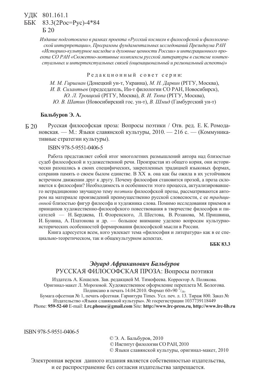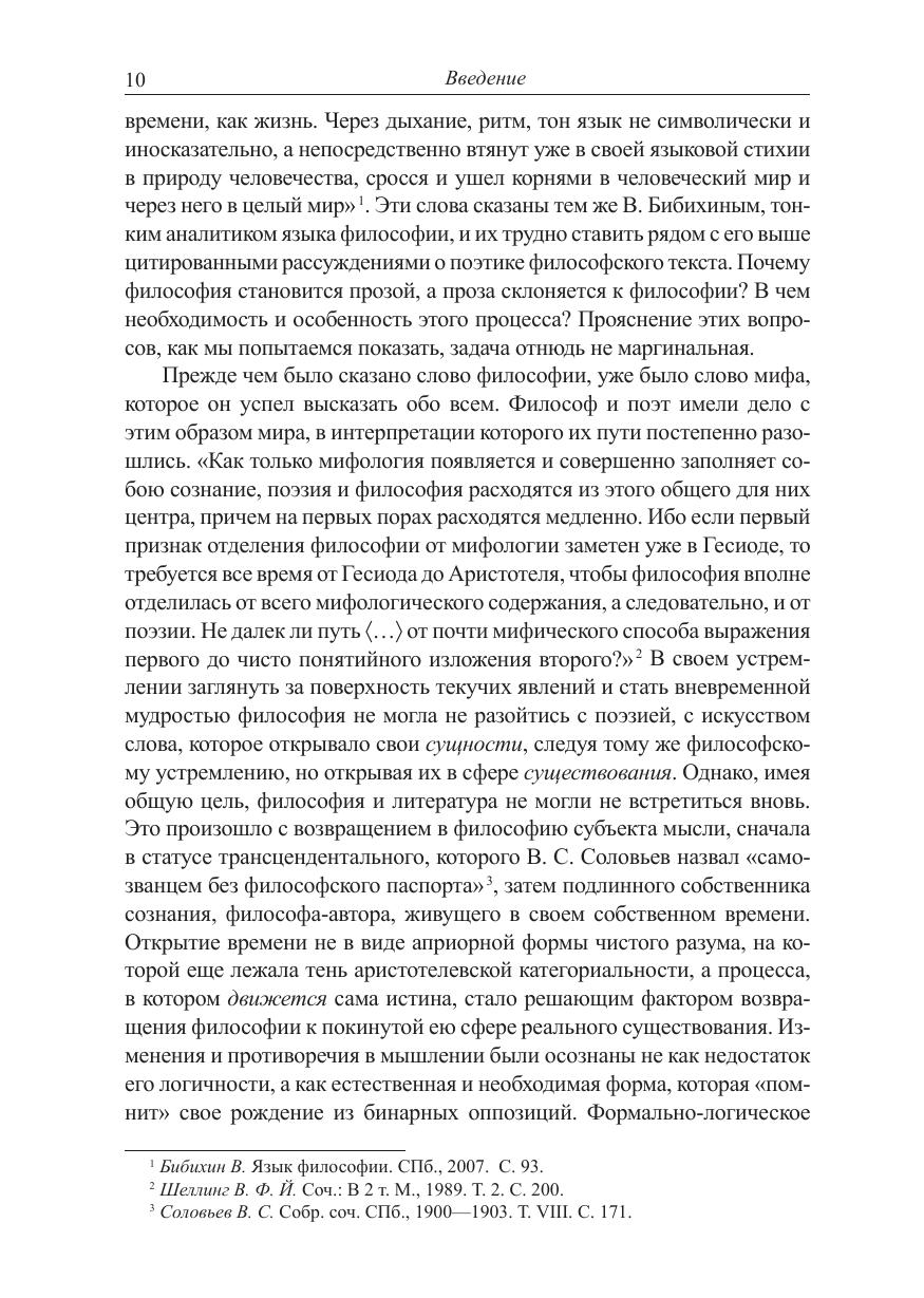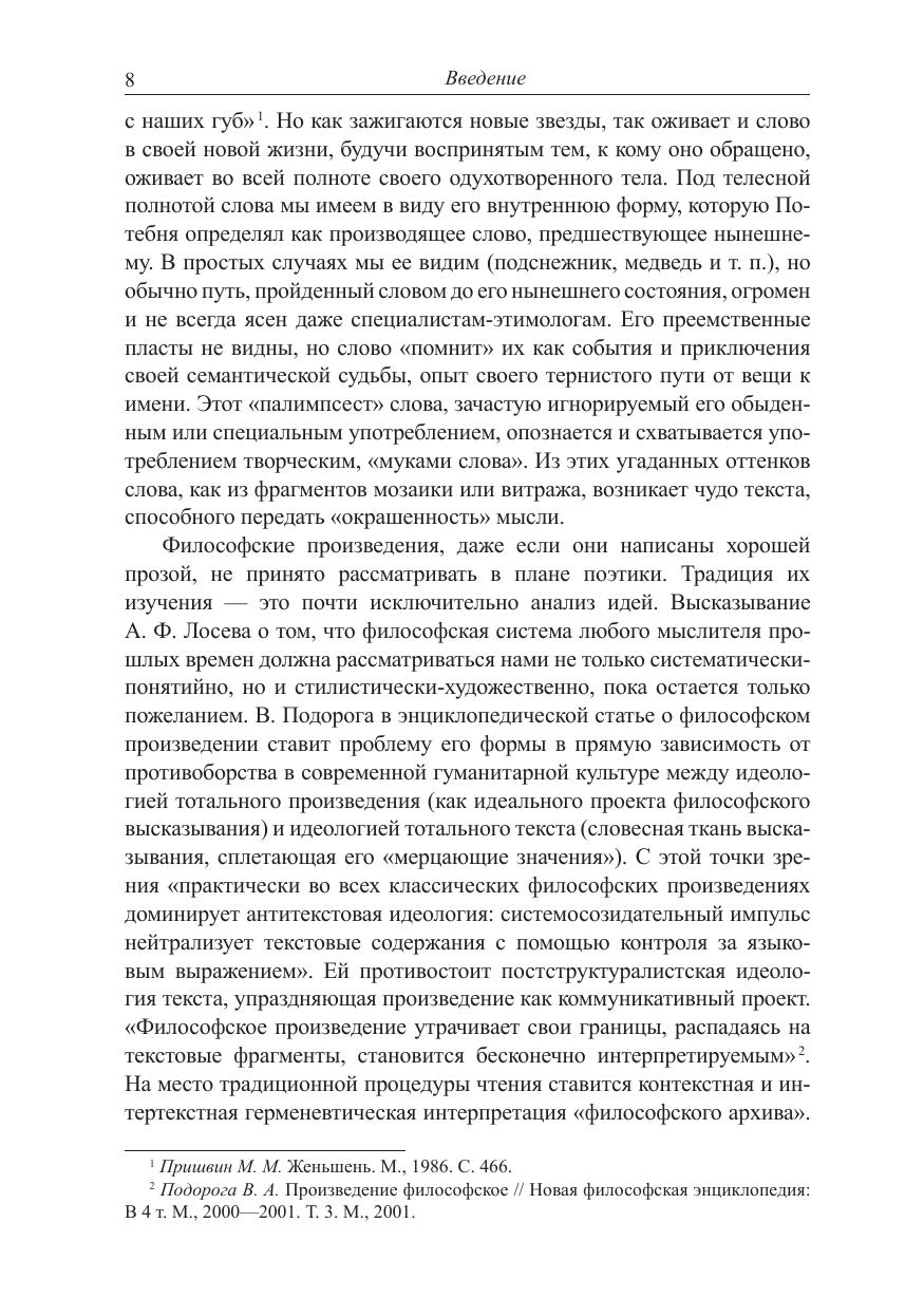 Работа представляет собой итог многолетних размышлений автора над близостью судеб философской и художественной речи. Произрастая из общего корня, они исторически разошлись в своих специфических, закрепленных традицией языковых формах, сохранив память о своем былом единстве. В XX в. она как бы ожила в их устойчивом встречном движении друг к другу. Почему философия становится прозой, а проза склоняется к философии? Необходимость и особенности этого процесса, актуализировавшего нетрадиционно звучащую тему поэтики философской прозы, рассматриваются автором на материале произведений преимущественно русской словесности, с ее традиционной близостью фигур философа и художника слова. Помимо исследования приёмов и принципов художественно-философского повествования в творчестве философов и писателей Н. Бердяева, П. Флоренского, Л. Шестова, В. Розанова, М. Пришвина, И. Бунина, А. Платонова и др.- большое внимание уделено вопросам культурно-исторических особенностей формирования философской мысли в России. Книга адресуется всем, кого увлекает тема «философия и литература» как в ее специально-теоретическом, так и общекультурном аспектах.