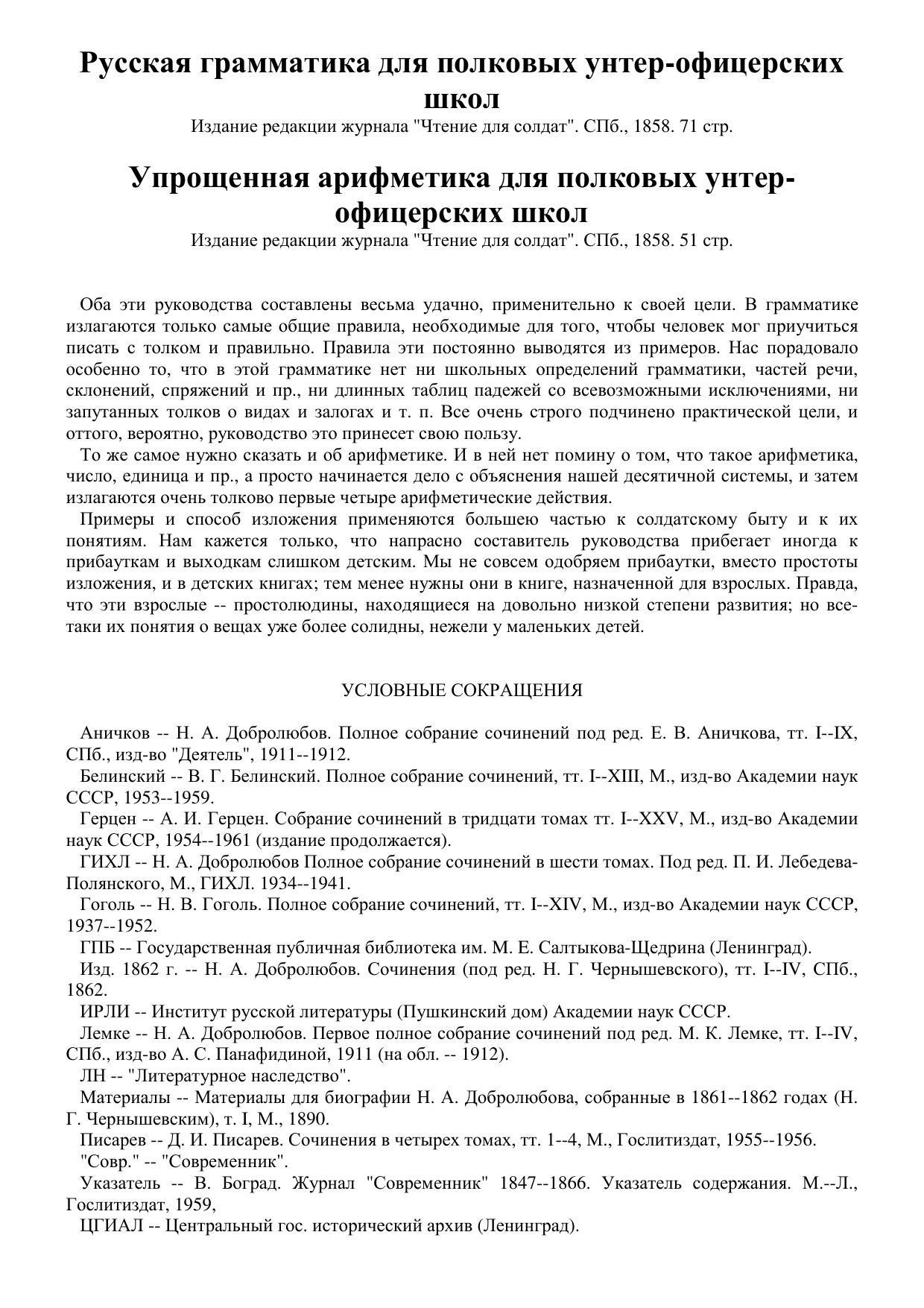 Русская грамматика для полковых унтер-офицерских школ. Упрощенная арифметика для полковых унтер-офицерских школ