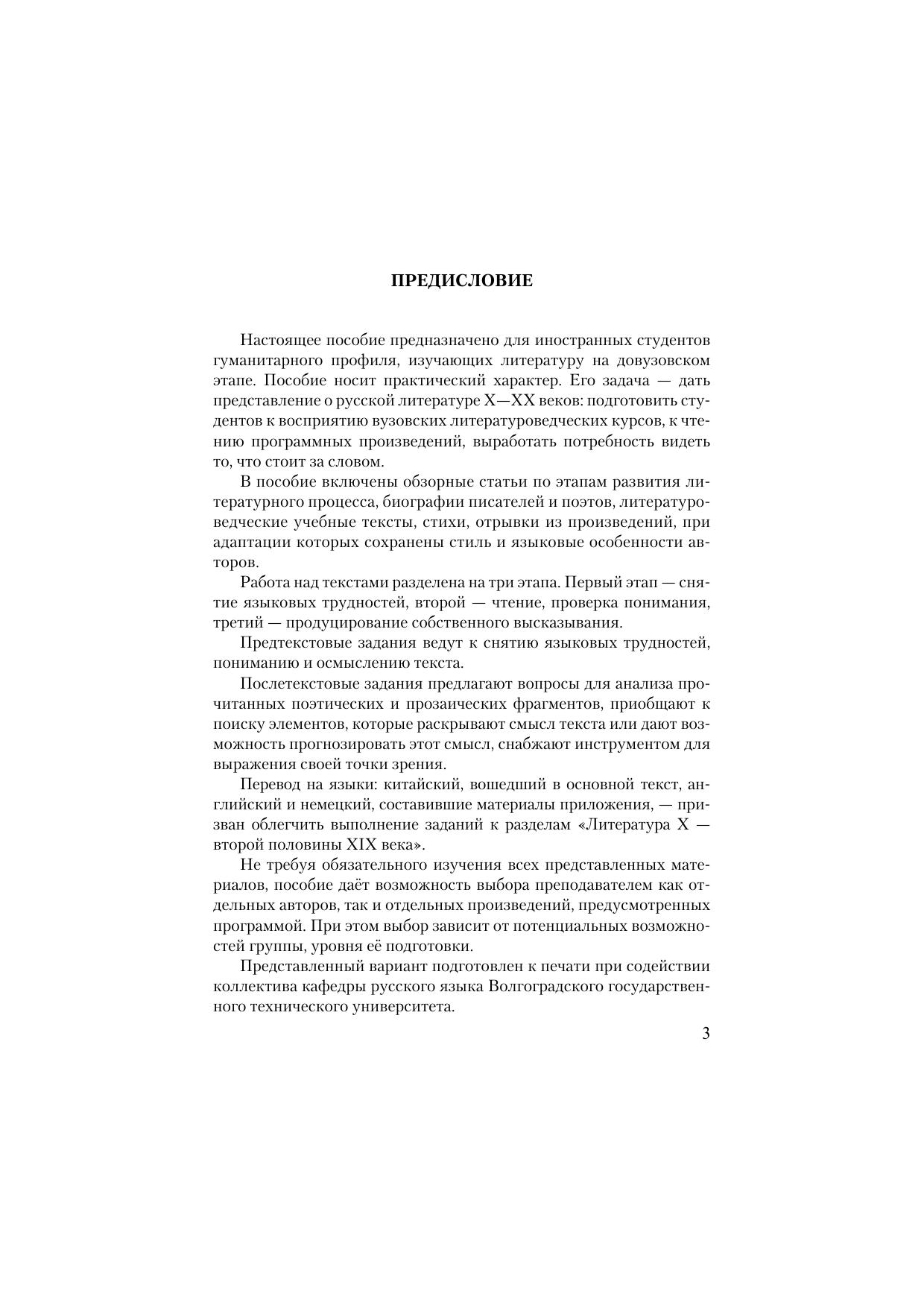 Пособие предназначено для работы с иностранными студентами, приступающими под руководством преподавателя к изучению русской литературы на довузовском этапе обучения. Структурно оно включает обзорные статьи по этапам развития литературного процесса, литературоведческие учебные тексты, стихи, отрывки из прозаических произведений. При адаптации отрывков сохранены стиль и языковые особенности авторов. Пособие снабжено предтекстовыми заданиями, нацеленными на работу с лексикой, вдумчивое
