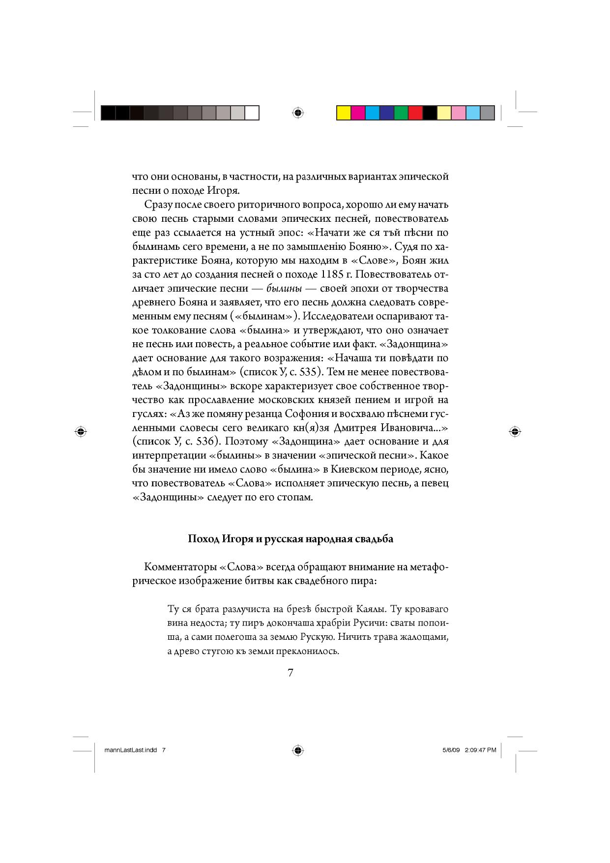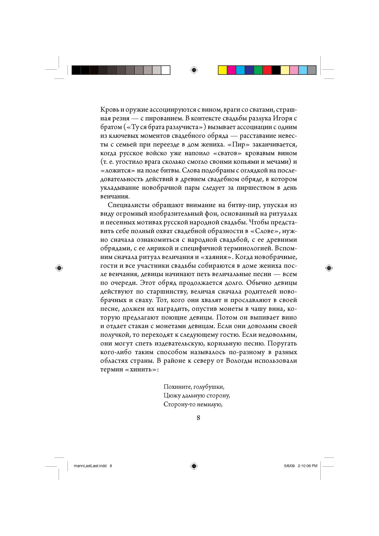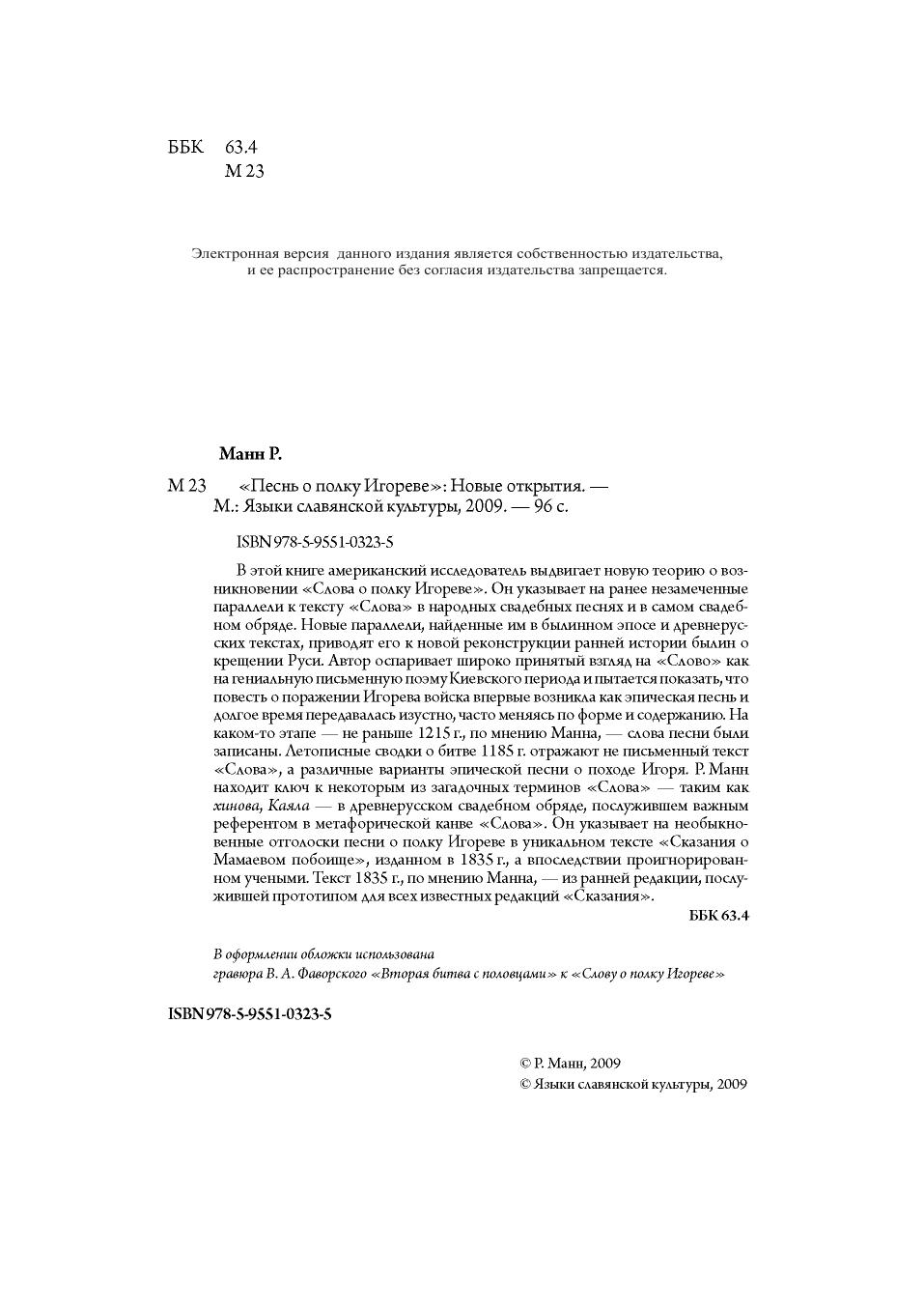 В этой книге американский исследователь выдвигает новую теорию о возникновении "Слова о полку Игореве". Он указывает на ранее незамеченные параллели к тексту "Слова" в народных свадебных песнях и в самом свадебном обряде. Новые параллели, найденные им в былинном эпосе и древнерусских текстах, приводят его к новой реконструкции ранней истории былин о крещении Руси. Автор оспаривает широко принятый взгляд на "Слово" как на гениальную письменную поэму Киевского периода и пытается показать, что повесть о поражении Игорева войска впервые возникла как эпическая песнь и долгое время передавалась изустно, часто меняясь по форме и содержанию. На каком-то этапе - не раньше 1215 г., по мнению Манна, - слова песни были записаны. Летописные сводки о битве 1185 г. отражают не письменный текст "Слова", а различные варианты эпической песни о походе Игоря. Р.Манн находит ключ к некоторым из загадочных терминов "Слова" - таким как хинова, Каяла - в древнерусском свадебном обряде, послужившем важным референтом в метафорической канве "Слова". Он указывает на необыкновенные отголоски песни о полку Игореве в уникальном тексте "Сказания о Мамаевом побоище", изданном в 1835 г., а впоследствии проигнорированном учеными. Текст 1835 г., по мнению Манна, - из ранней редакции, послужившей прототипом для всех известных редакций "Сказания". Для широкого круга читателей.