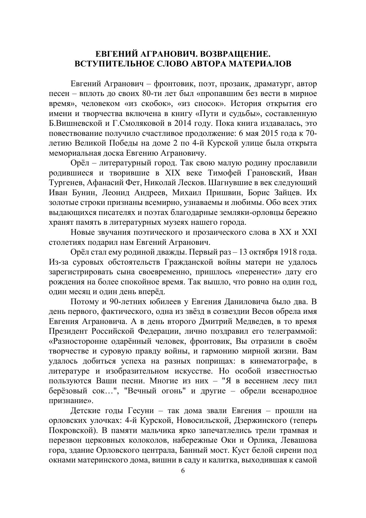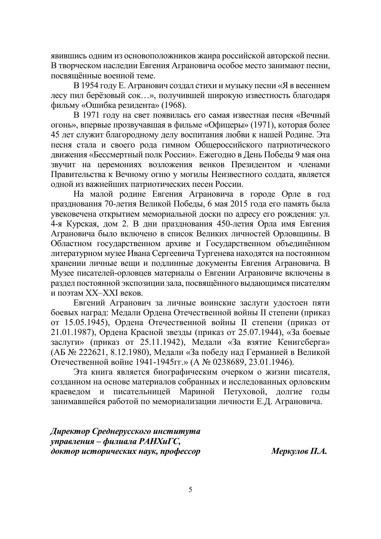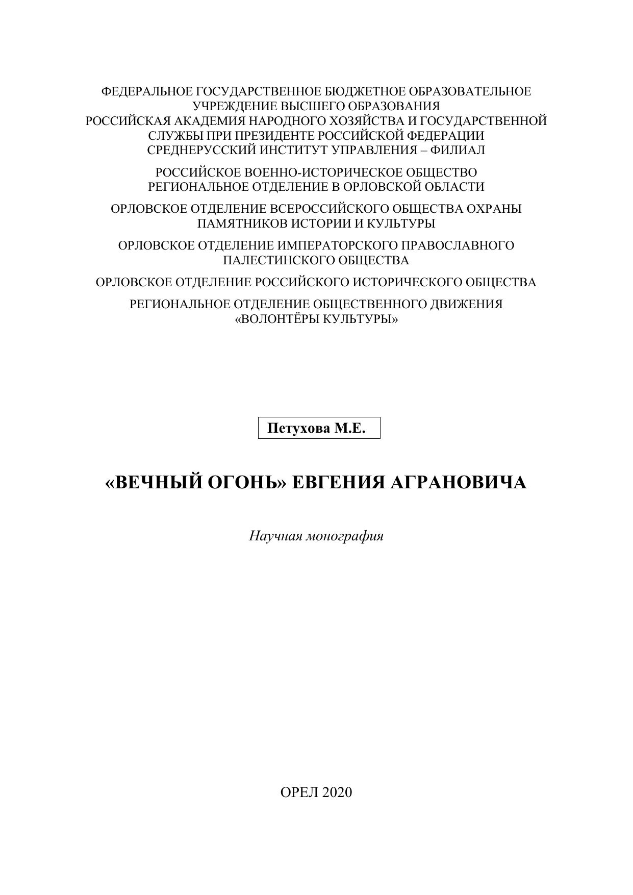 Евгений Данилович, известный советский и российский писатель, поэт и бард, внёс весомый вклад в современную отечественную культуру, явившись одним из основоположников жанра российской авторской песни. В творческом наследии Евгения Аграновича особое место занимают песни, посвящённые военной теме. Е. Агранович создал стихи и музыку песни «Я в весеннем лесу пил берёзовый сок…», а в 1971 году на свет появилась его самая известная песня «Вечный огонь», впервые прозвучавшая в фильме «Офицеры» (1971), которая более 45 лет служит благородному делу воспитания любви к нашей Родине. В монографии представлены материалы, собранные Мариной Петуховой, исследователем жизни и творчества Е.Д. Аграновича. Монография предназначена для историков и людей, интересующихся прошлым Орловской области и военной историей Российского государства. Материалы публикуются в авторской редакции.