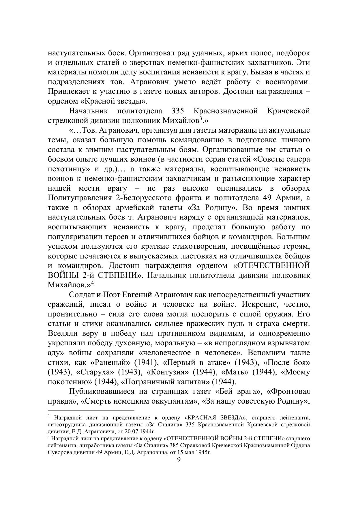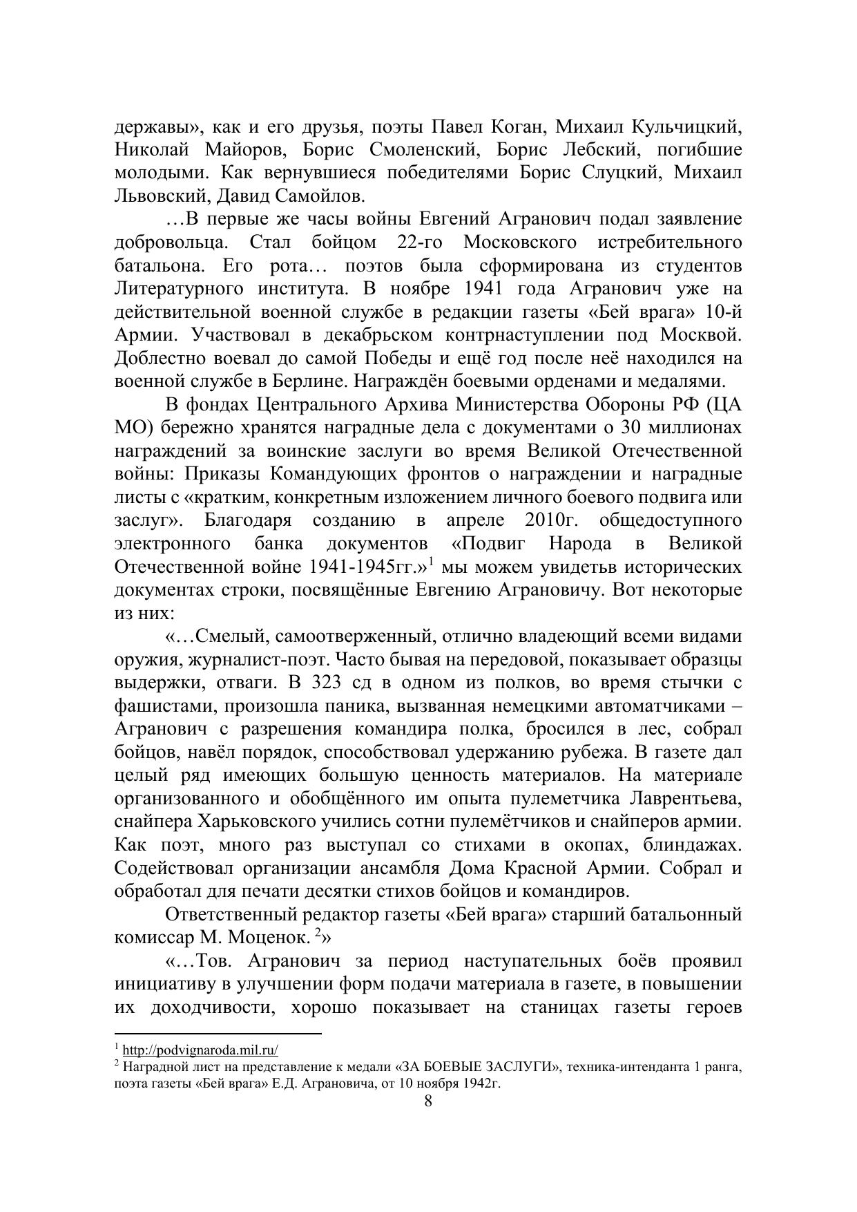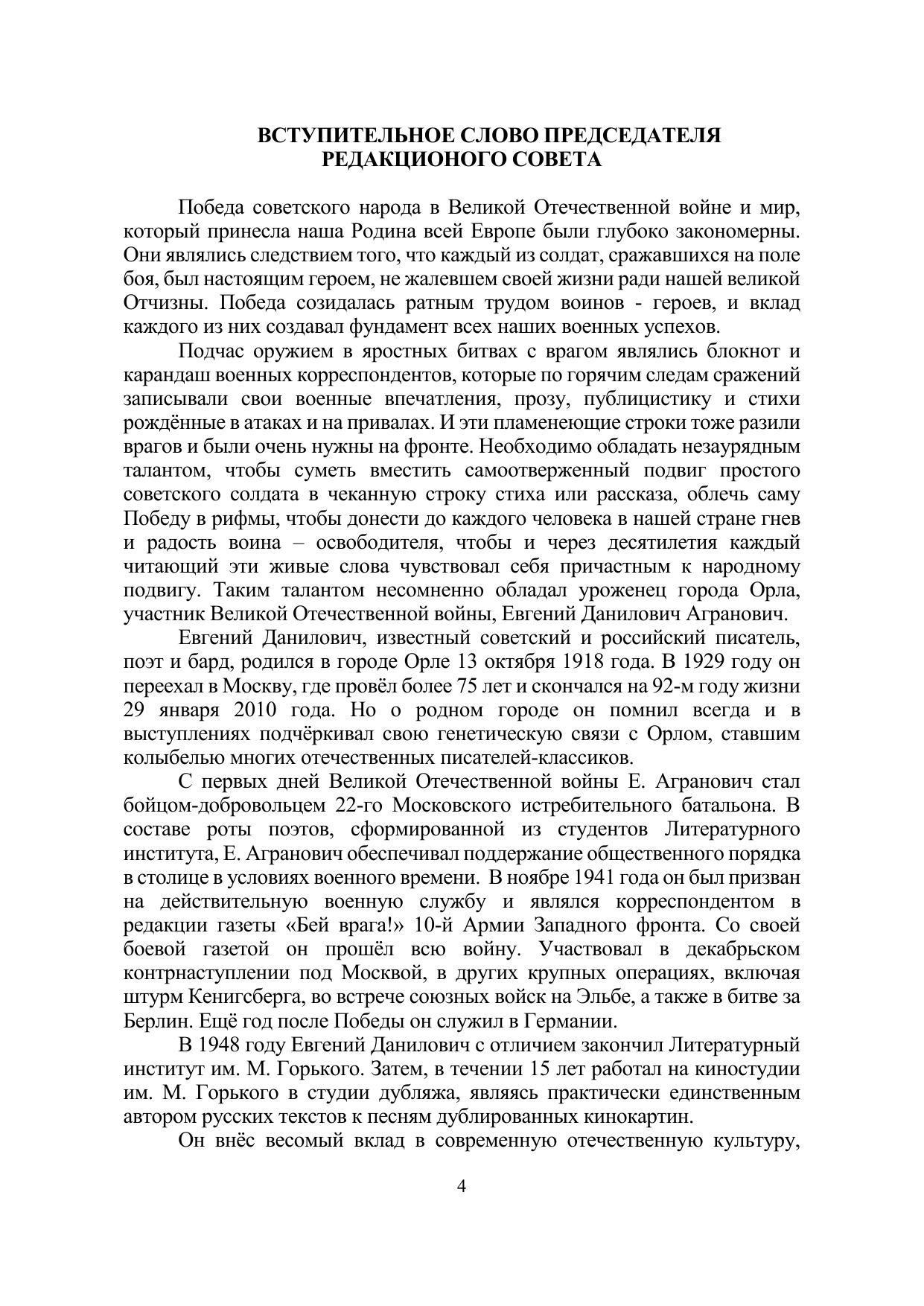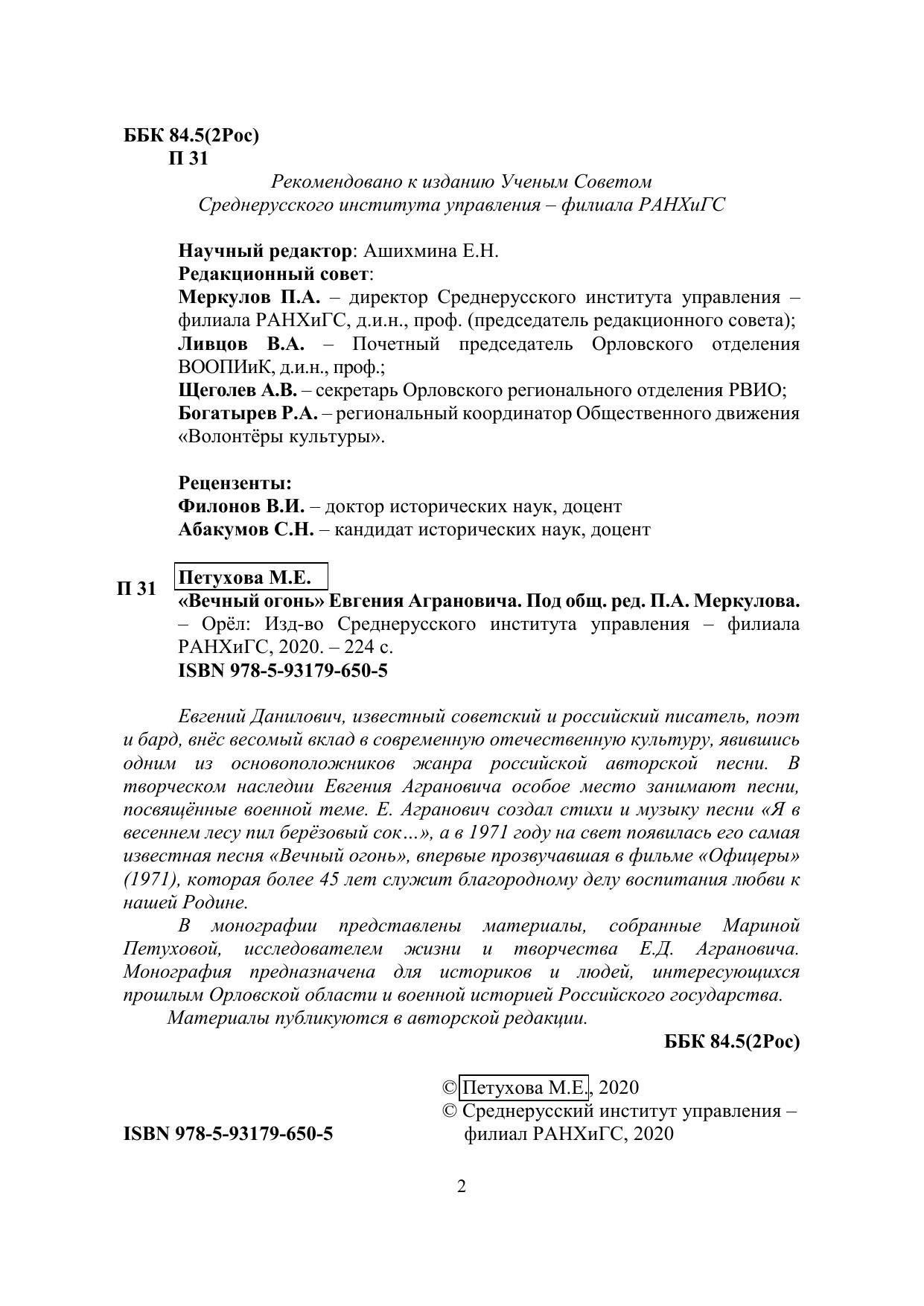 Евгений Данилович, известный советский и российский писатель, поэт и бард, внёс весомый вклад в современную отечественную культуру, явившись одним из основоположников жанра российской авторской песни. В творческом наследии Евгения Аграновича особое место занимают песни, посвящённые военной теме. Е. Агранович создал стихи и музыку песни «Я в весеннем лесу пил берёзовый сок…», а в 1971 году на свет появилась его самая известная песня «Вечный огонь», впервые прозвучавшая в фильме «Офицеры» (1971), которая более 45 лет служит благородному делу воспитания любви к нашей Родине. В монографии представлены материалы, собранные Мариной Петуховой, исследователем жизни и творчества Е.Д. Аграновича. Монография предназначена для историков и людей, интересующихся прошлым Орловской области и военной историей Российского государства. Материалы публикуются в авторской редакции.