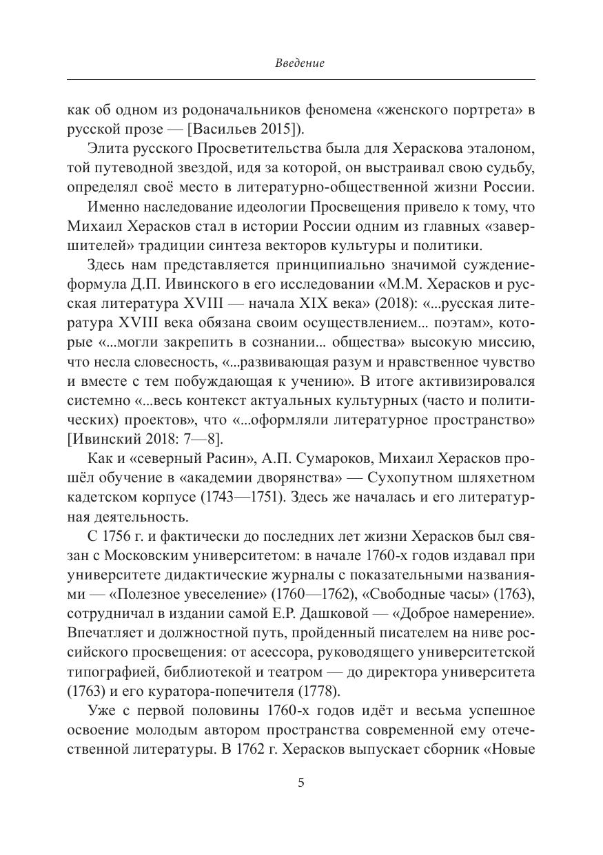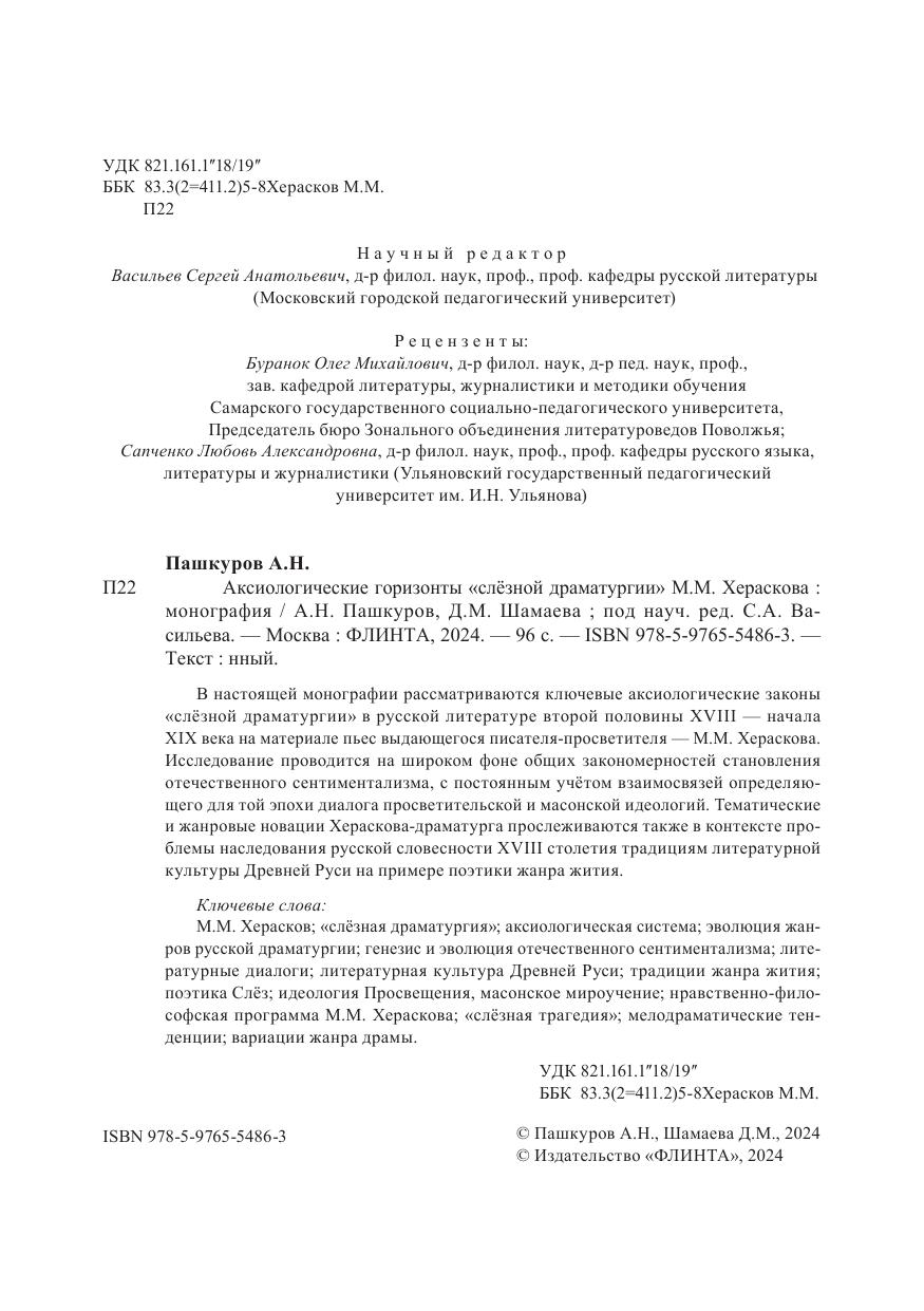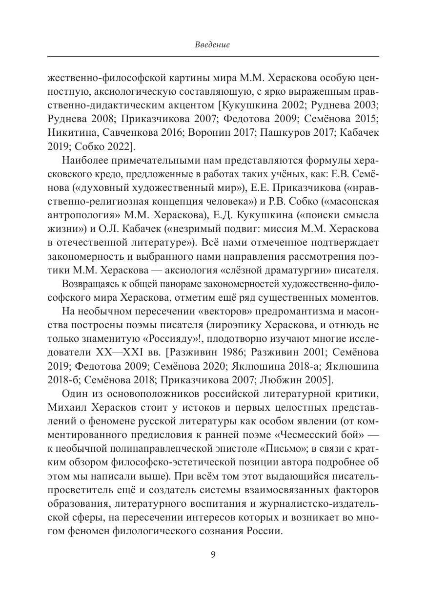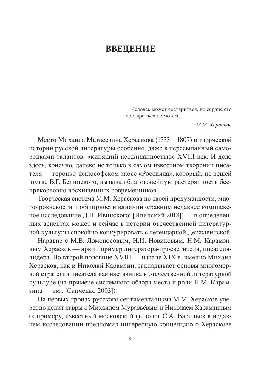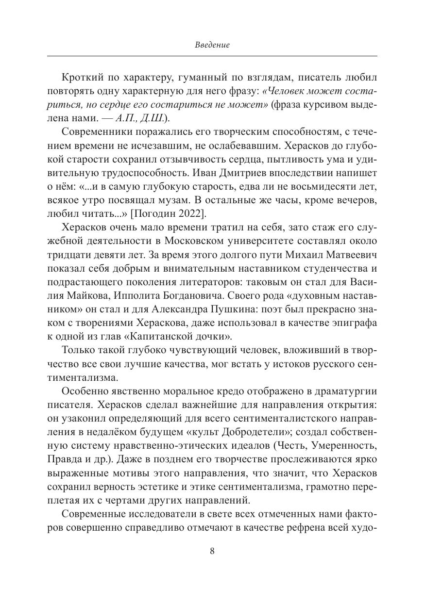 В настоящей монографии рассматриваются ключевые аксиологические законы «слёзной драматургии» в русской литературе второй половины XVIII — начала XIX века на материале пьес выдающегося писателя-просветителя — М.М. Хераскова. Исследование проводится на широком фоне общих закономерностей становления отечественного сентиментализма, с постоянным учётом взаимосвязей определяю- щего для той эпохи диалога просветительской и масонской идеологий. Тематические и жанровые новации Хераскова-драматурга прослеживаются также в контексте проблемы наследования русской словесности XVIII столетия традициям литературной культуры Древней Руси на примере поэтики жанра жития.