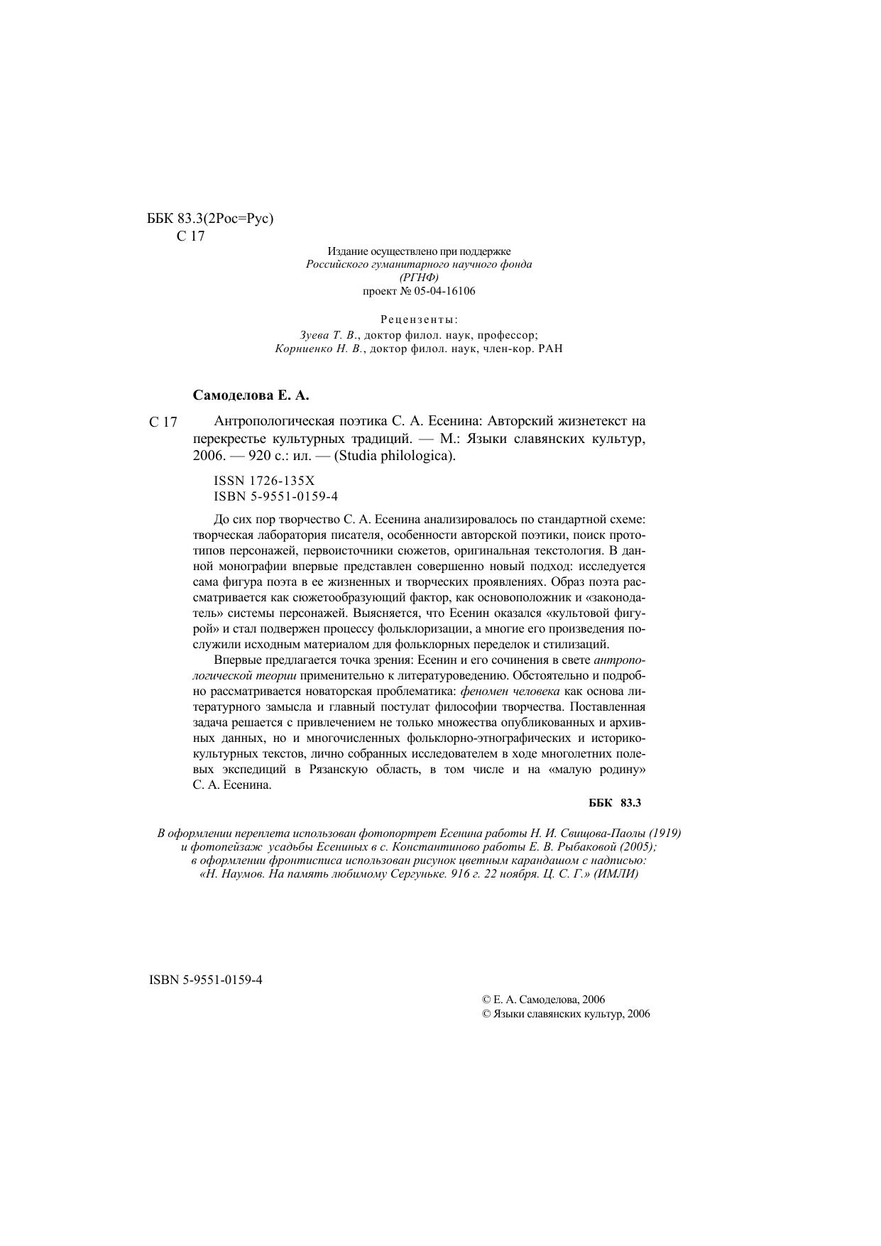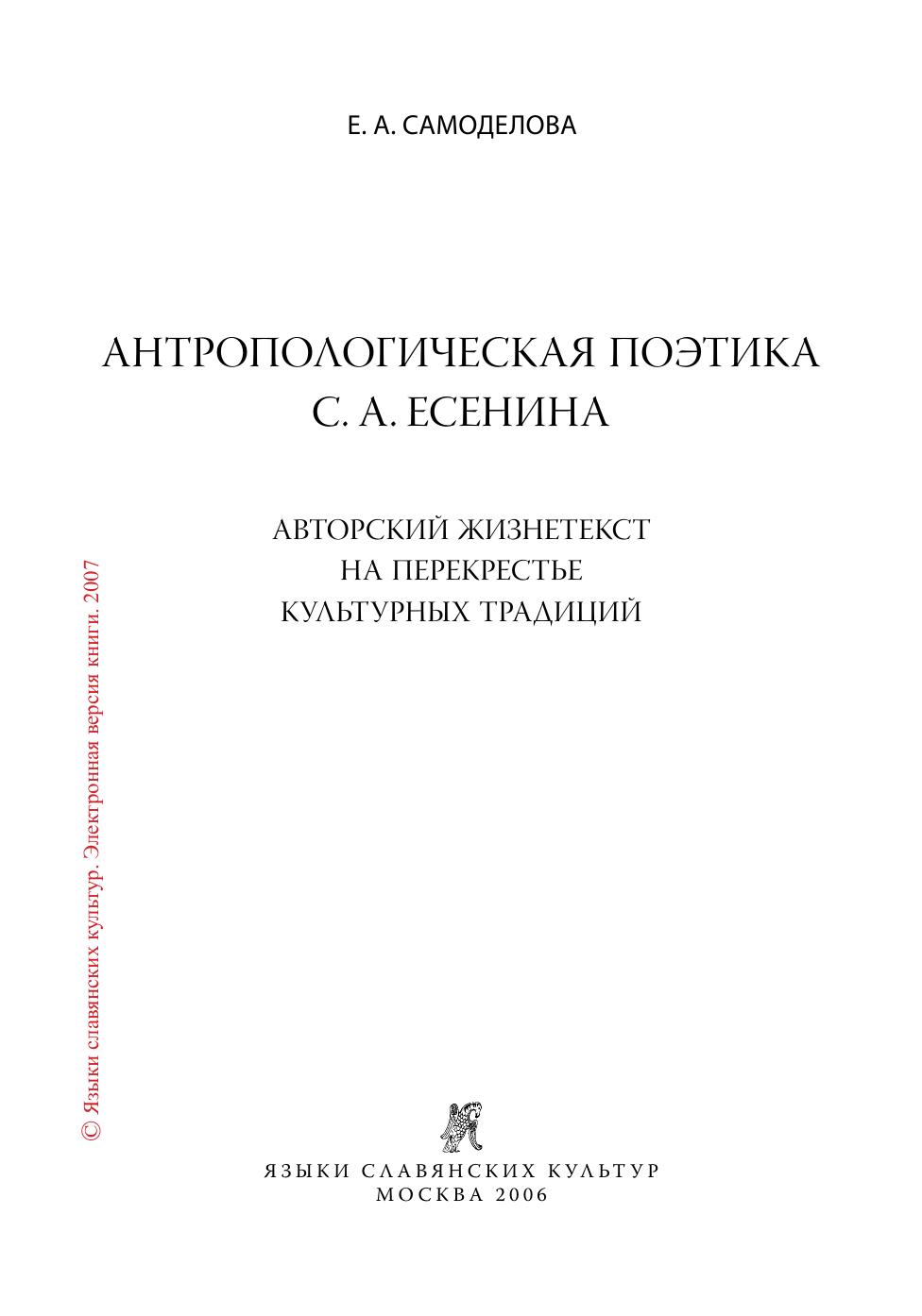 До сих пор творчество С. А. Есенина анализировалось по стандартной схеме: творческая лаборатория писателя, особенности авторской поэтики, поиск прототипов персонажей, первоисточники сюжетов, оригинальная текстология. В данной монографии впервые представлен совершенно новый подход: исследуется сама фигура поэта в ее жизненных и творческих проявлениях. Образ поэта рассматривается как сюжетообразующий фактор, как основоположник и «законодатель» системы персонажей. Выясняется, что Есенин оказался «культовой фигурой» и стал подвержен процессу фольклоризации, а многие его произведения послужили исходным материалом для фольклорных переделок и стилизаций. Впервые предлагается точка зрения: Есенин и его сочинения в свете антропологической теории применительно к литературоведению. Обстоятельно и подробно рассматривается новаторская проблематика: феномен человека как основа ли-тературного замысла и главный постулат философии творчества. Поставленная задача решается с привлечением не только множества опубликованных и архивных данных, но и многочисленных фольклорно-этнографических и историко-культурных текстов, лично собранных исследователем в ходе многолетних полевых экспедиций в Рязанскую область, в том числе и на «малую родину» С. А. Есенина.