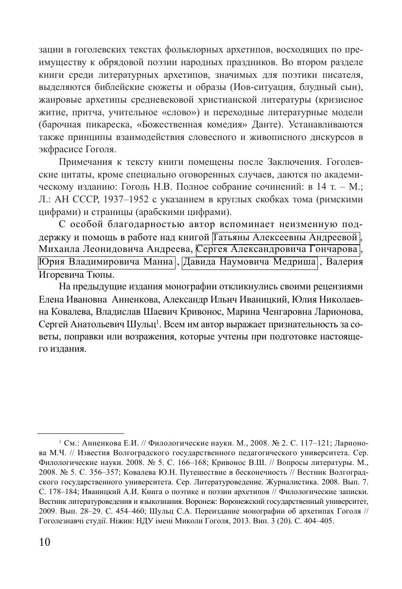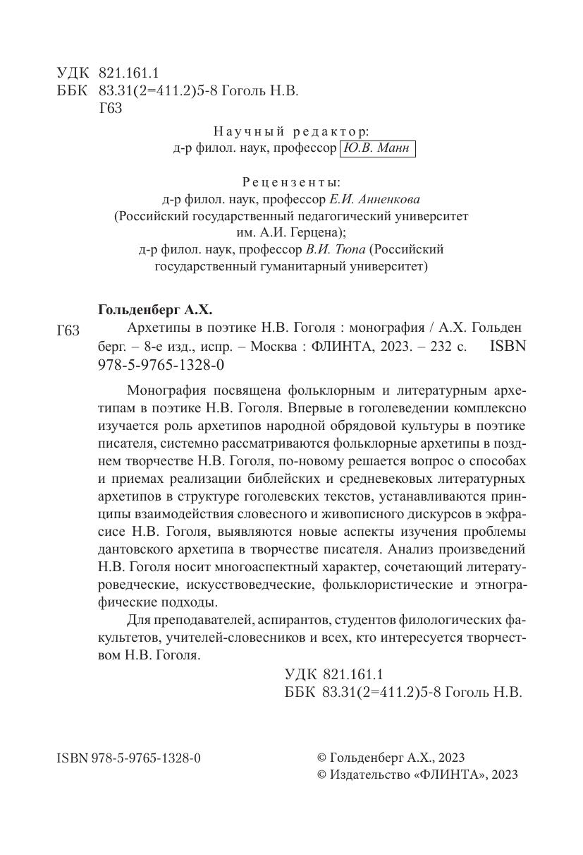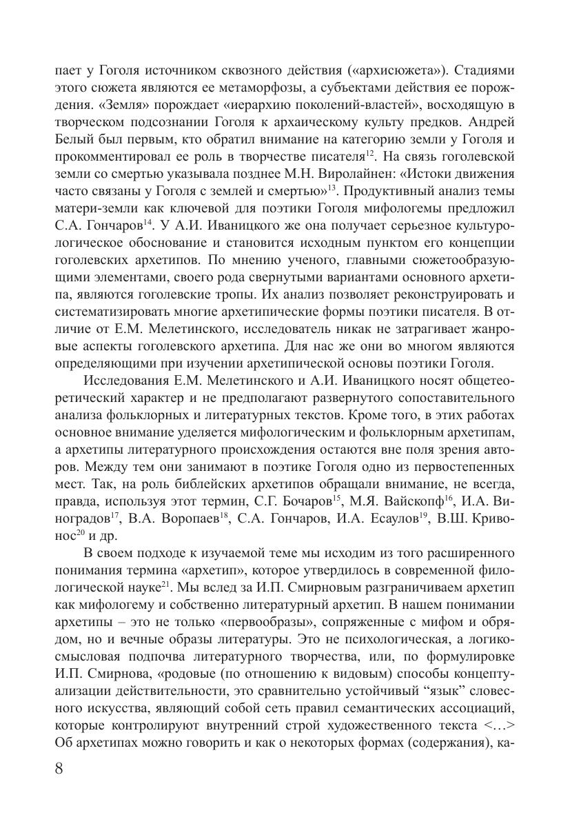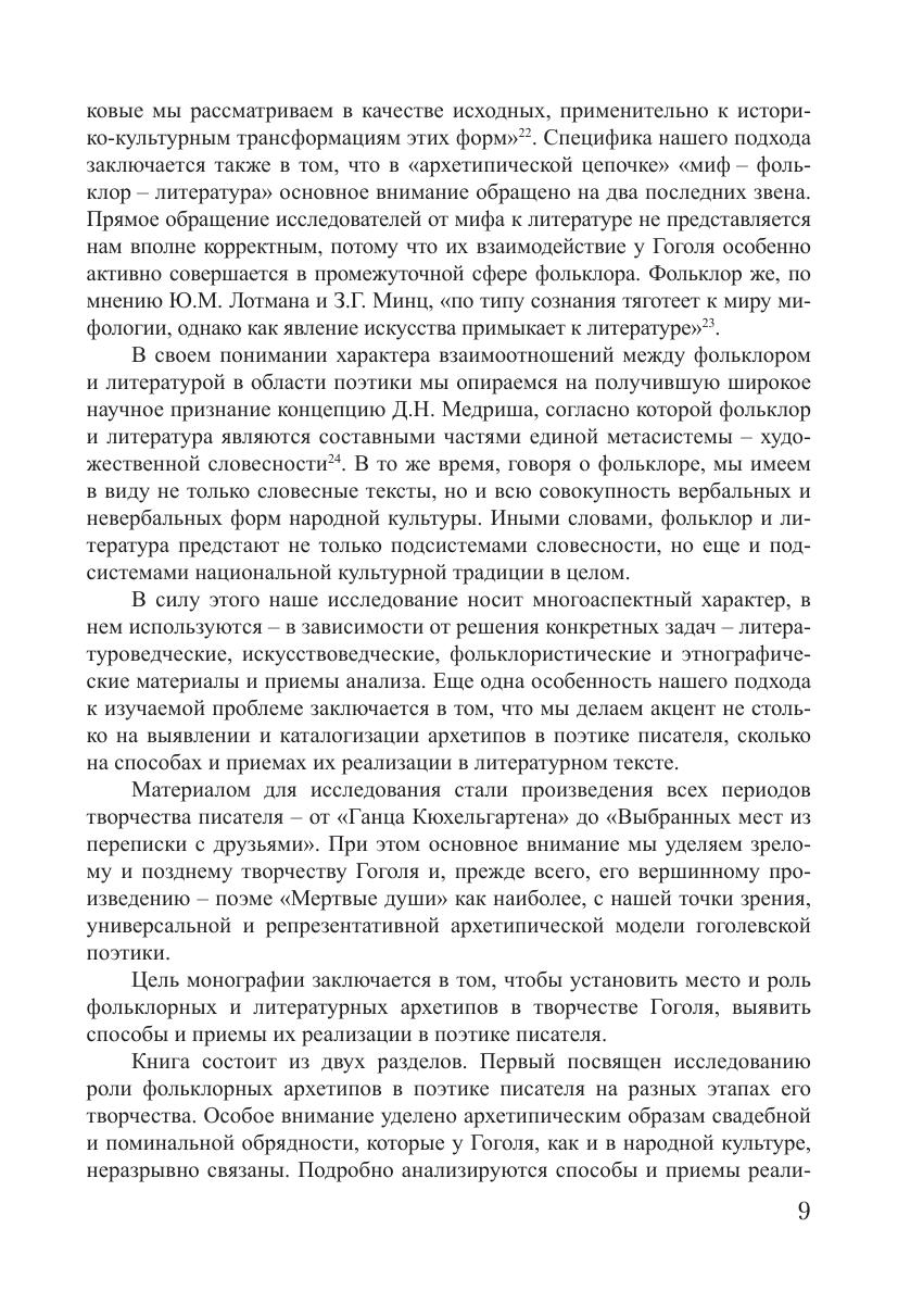 Монография посвящена фольклорным и литературным архетипам в поэтике Н.В. Гоголя. Впервые в гоголеведении комплексно изучается роль архетипов народной обрядовой культуры в поэтике писателя, системно рассматриваются фольклорные архетипы в позднем творчестве Н.В. Гоголя, поновому решается вопрос о способах и приемах реализации библейских и средневековых литературных архетипов в структуре гоголевских текстов, устанавливаются принципы взаимодействия словесного и живописного дискурсов в экфрасисе Н.В. Гоголя, выявляются новые аспекты изучения проблемы дантовского архетипа в творчестве писателя. Анализ произведений Н.В. Гоголя носит многоаспектный характер, сочетающий литерату-