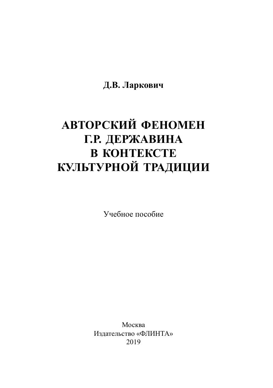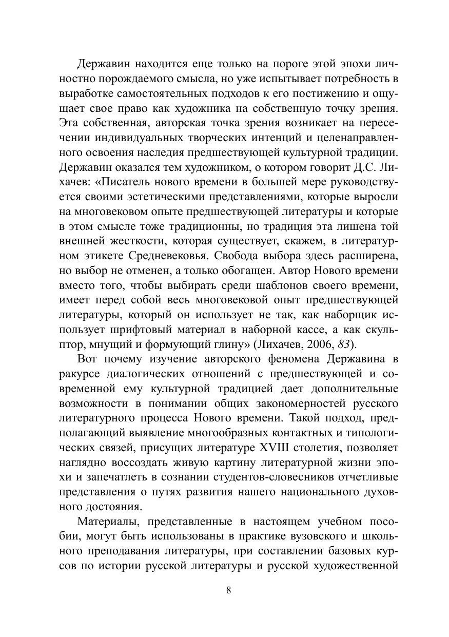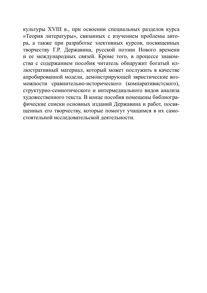 Данное пособие представляет собой опыт комплексного исследования творчества крупнейшего русского поэта Г.Р. Державина в контексте развития русской художественной и интеллектуальной культуры его времени. В работе выявляются истоки формирования авторского сознания Державина в контексте русской и европейской литературной традиции Нового времени; приводится характеристика его философских и эстетических интересов, дается оценка его культуртрегерским инициативам и определяется их значение для общего развития отечественной культуры на рубеже XVIII—XIX вв.